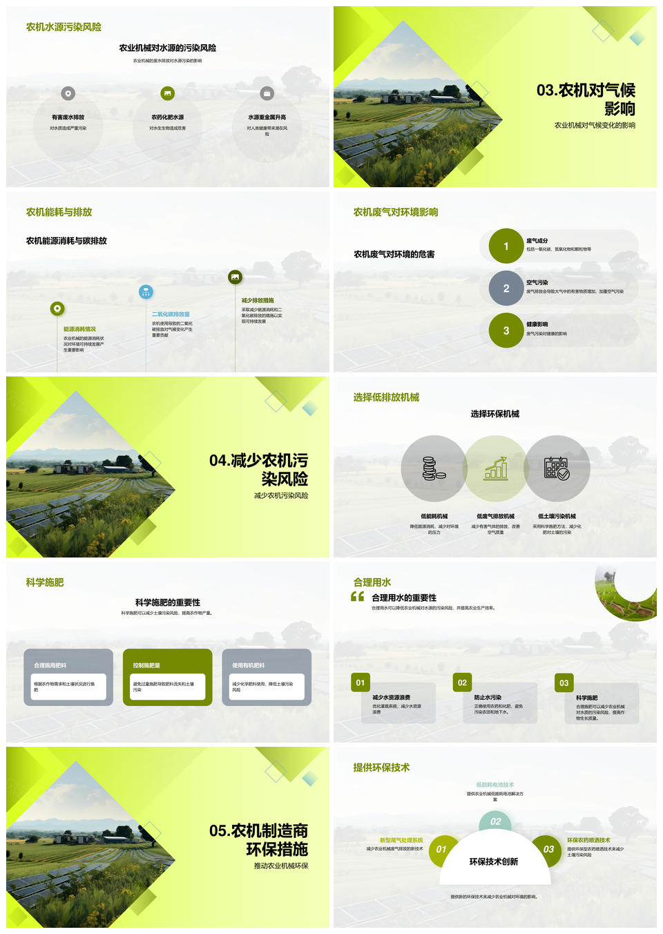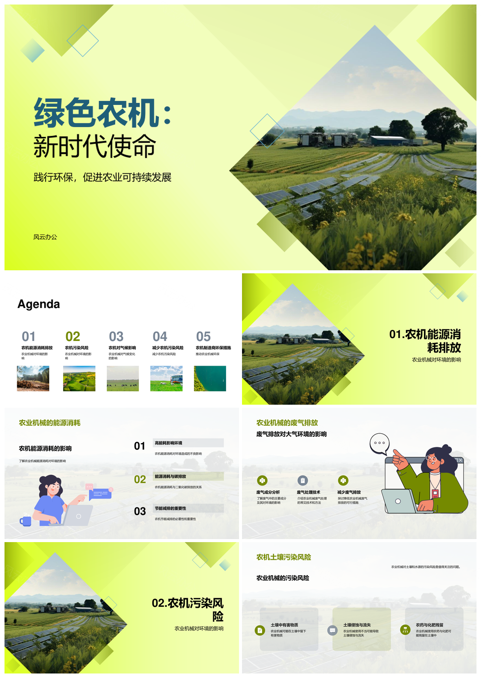 风云办公提供的绿色农机可持续发展降污节能护土减排PPT模板,下载格式为pptx,一共19页,作品中文字及图均可以修改和编辑,图片更改请在作品中右键图片并更换,文字修改请直接点击文字进行修改。
