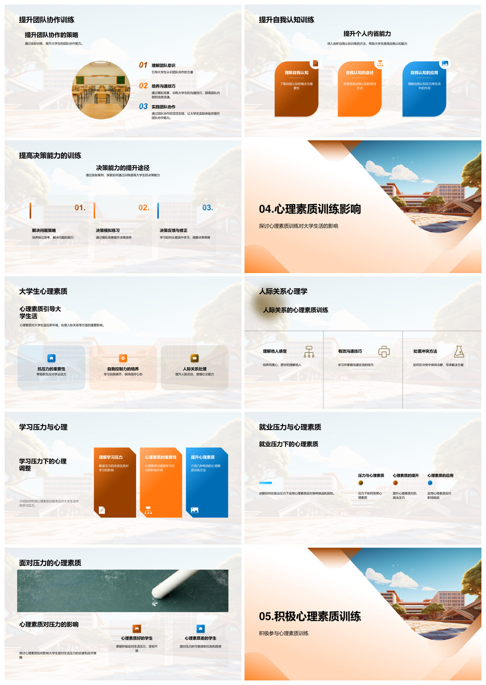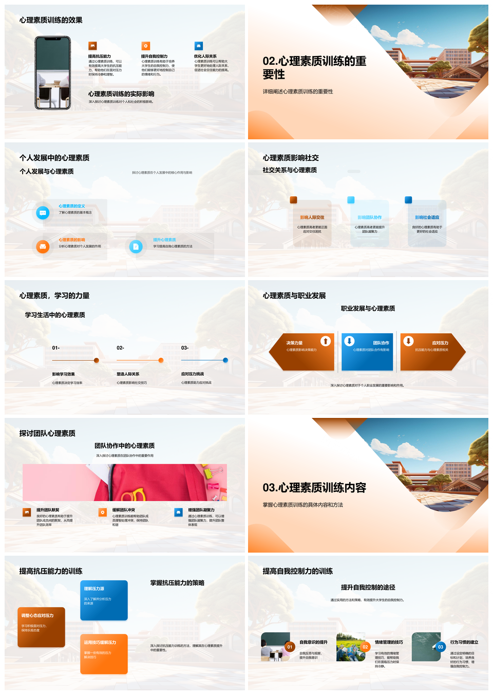 风云办公提供的大学生心理素质抗压自我控制训练教育PPT模板,下载格式为pptx,一共33页,作品中文字及图均可以修改和编辑,图片更改请在作品中右键图片并更换,文字修改请直接点击文字进行修改。
