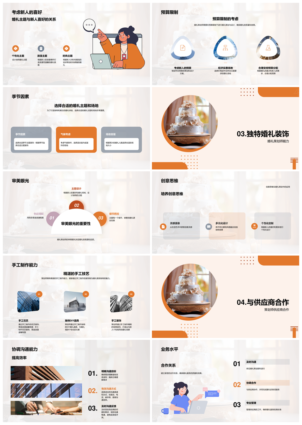 这是一张创意婚礼策划师设计新人预算季节审美蛋糕PPT模板,包含创意、婚礼、策划师、设计、新人、预算、季节、审美、蛋糕等主题内容,也可用作创意婚礼策划师设计、婚礼策划师设计新人、策划师设计新人预算、设计新人预算季节、新人预算季节审美、预算季节审美蛋糕、创意婚礼策划师新人、婚礼策划师设计预算、策划师设计季节审美、新人预算季节蛋糕、婚礼策划师预算蛋糕、创意婚礼设计预算、设计季节审美蛋糕、创意婚礼季节蛋糕、预算季节蛋糕等PPT场景使用。 风云办公提供的创意婚礼策划师设计新人预算季节审美蛋糕PPT模板,下载格式为pptx,一共27页,作品中文字及图均可以修改和编辑,图片更改请在作品中右键图片并更换,文字修改请直接点击文字进行修改。