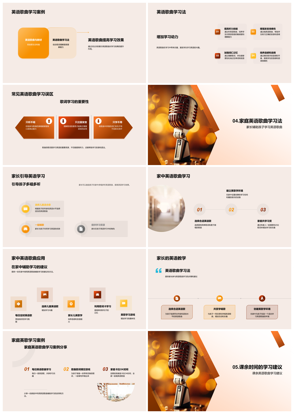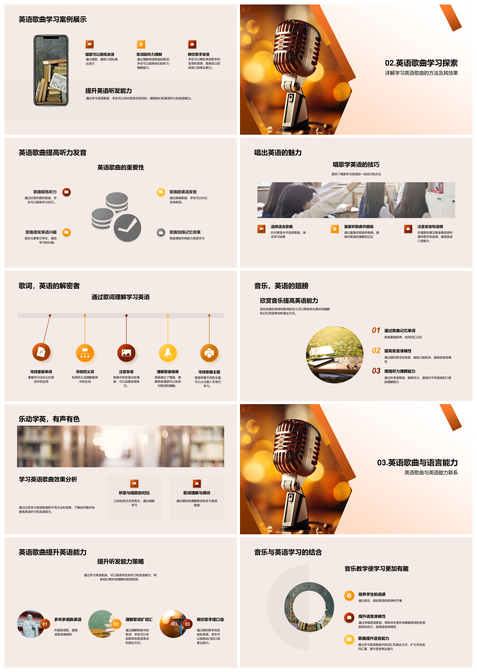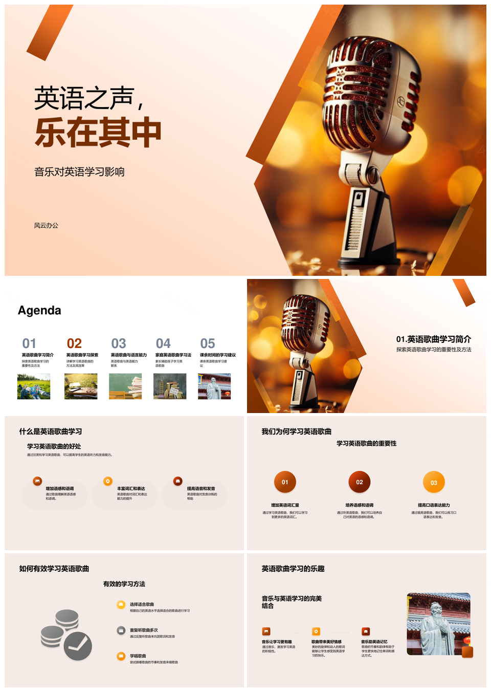 风云办公提供的小学英语歌曲学习法课件麦克风推荐PPT模板,下载格式为pptx,一共33页,作品中文字及图均可以修改和编辑,图片更改请在作品中右键图片并更换,文字修改请直接点击文字进行修改。