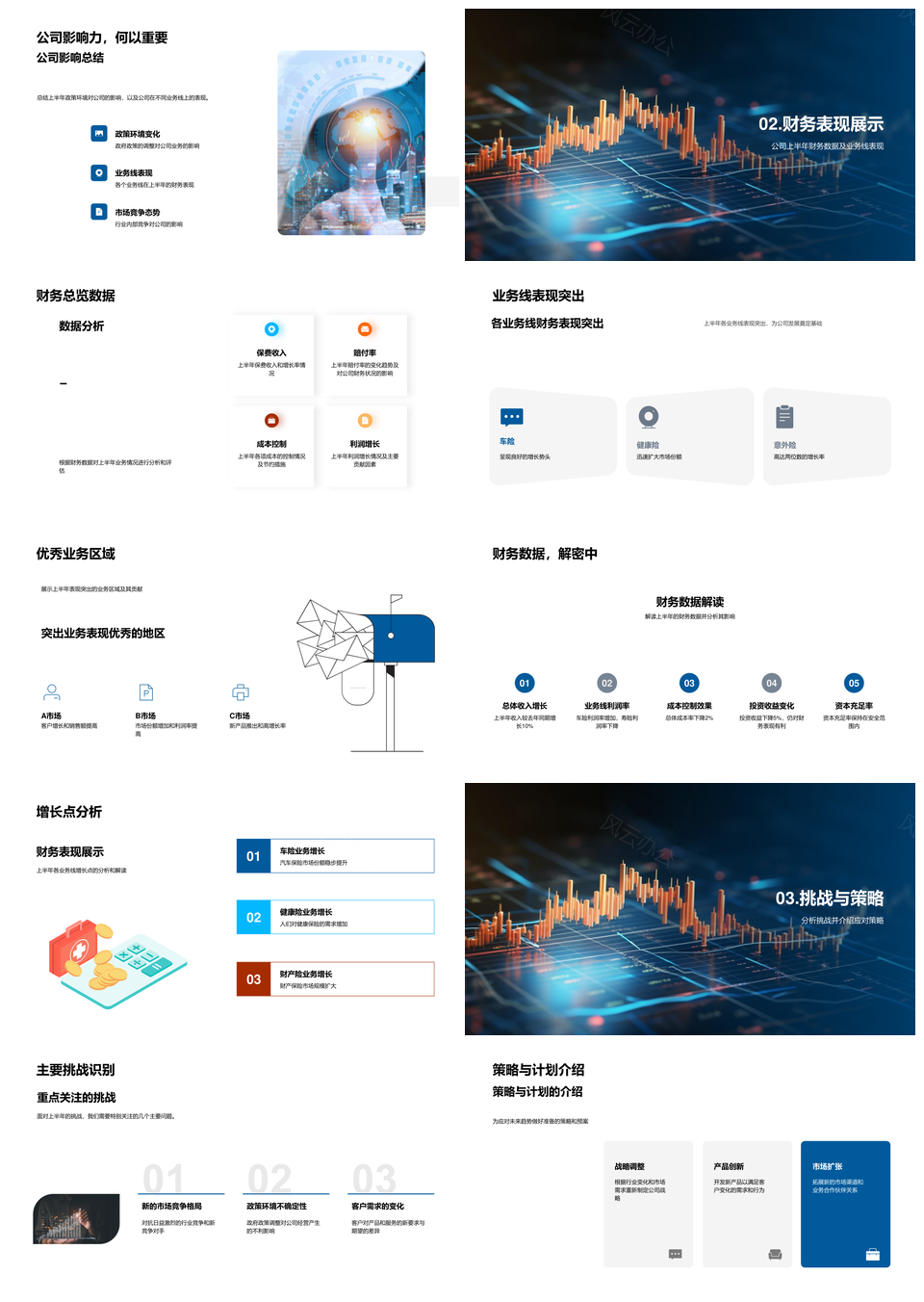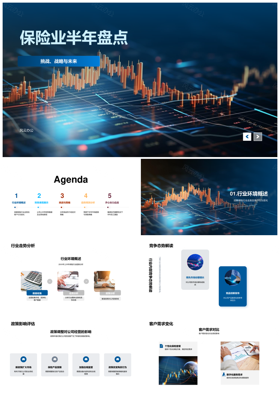 风云办公提供的保险业半年财务挑战策略趋势政策盘点PPT模板,下载格式为pptx,一共33页,作品中文字及图均可以修改和编辑,图片更改请在作品中右键图片并更换,文字修改请直接点击文字进行修改。