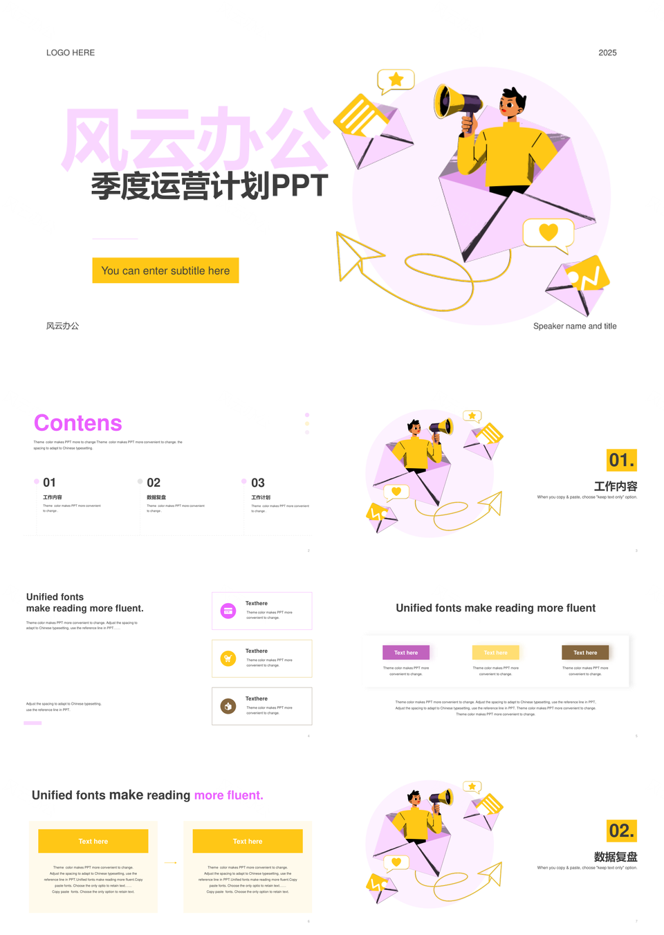 风云办公提供的2025紫黄简约扁平商业运营PPT模板,下载格式为pptx,一共15页,作品中文字及图均可以修改和编辑,图片更改请在作品中右键图片并更换,文字修改请直接点击文字进行修改。