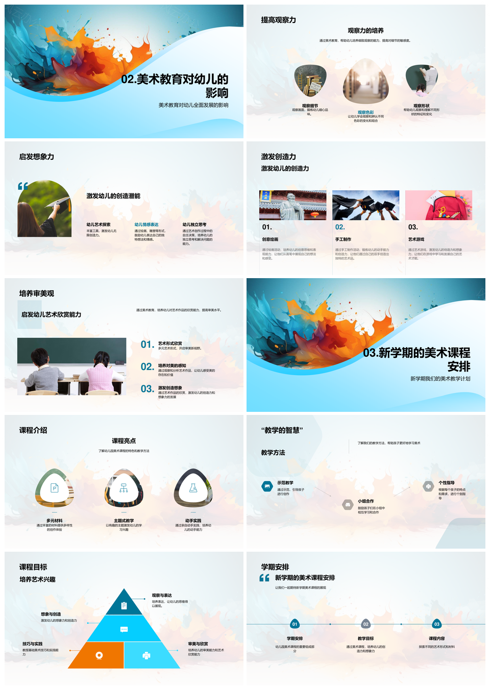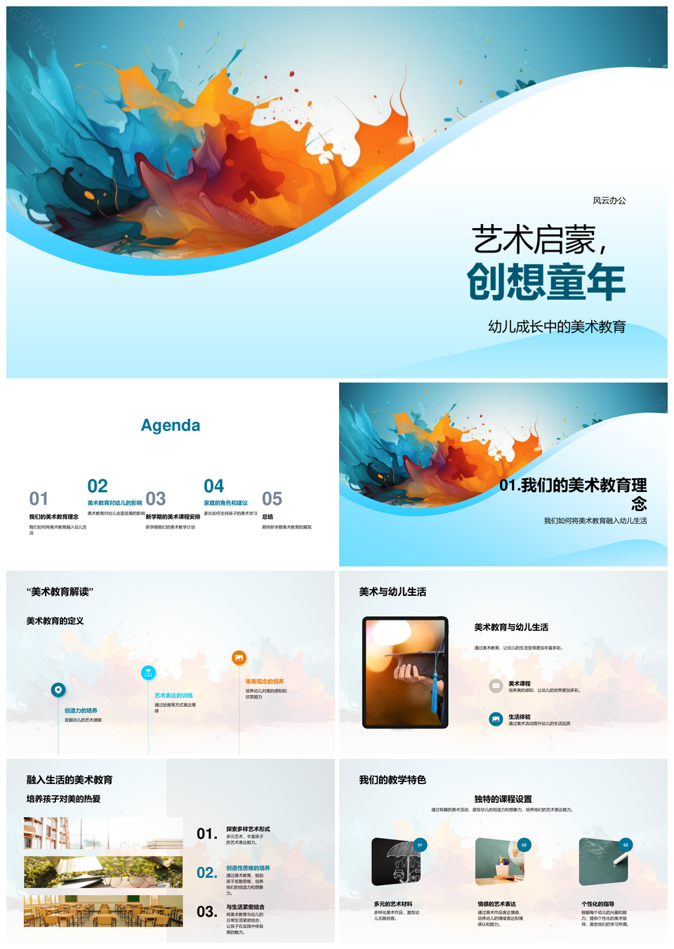 风云办公提供的艺术启蒙幼儿创想成长美术课PPT模板,下载格式为pptx,一共27页,作品中文字及图均可以修改和编辑,图片更改请在作品中右键图片并更换,文字修改请直接点击文字进行修改。