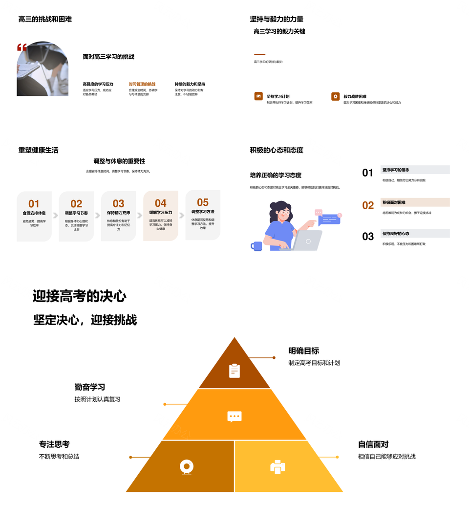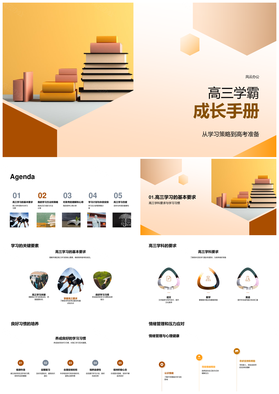 风云办公提供的高三学霸高效学习高考备考攻略PPT模板,下载格式为pptx,一共33页,作品中文字及图均可以修改和编辑,图片更改请在作品中右键图片并更换,文字修改请直接点击文字进行修改。