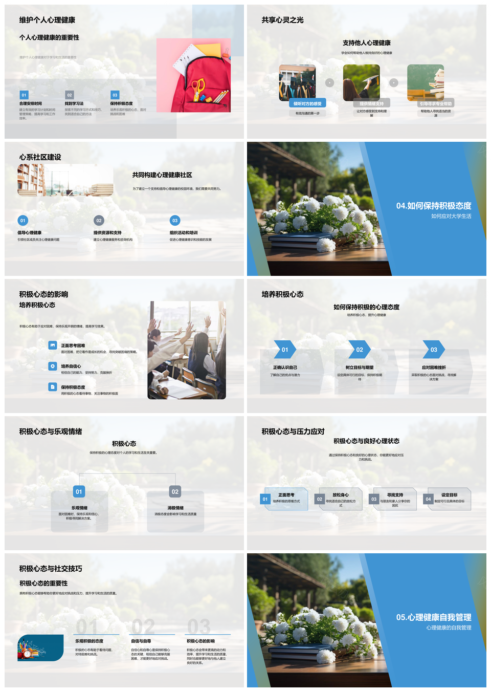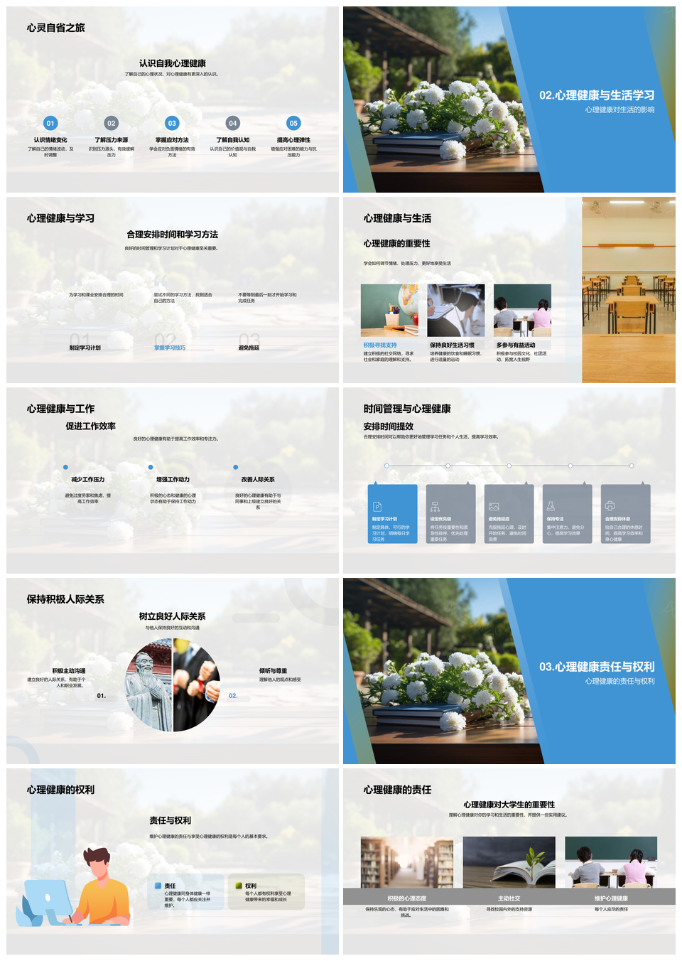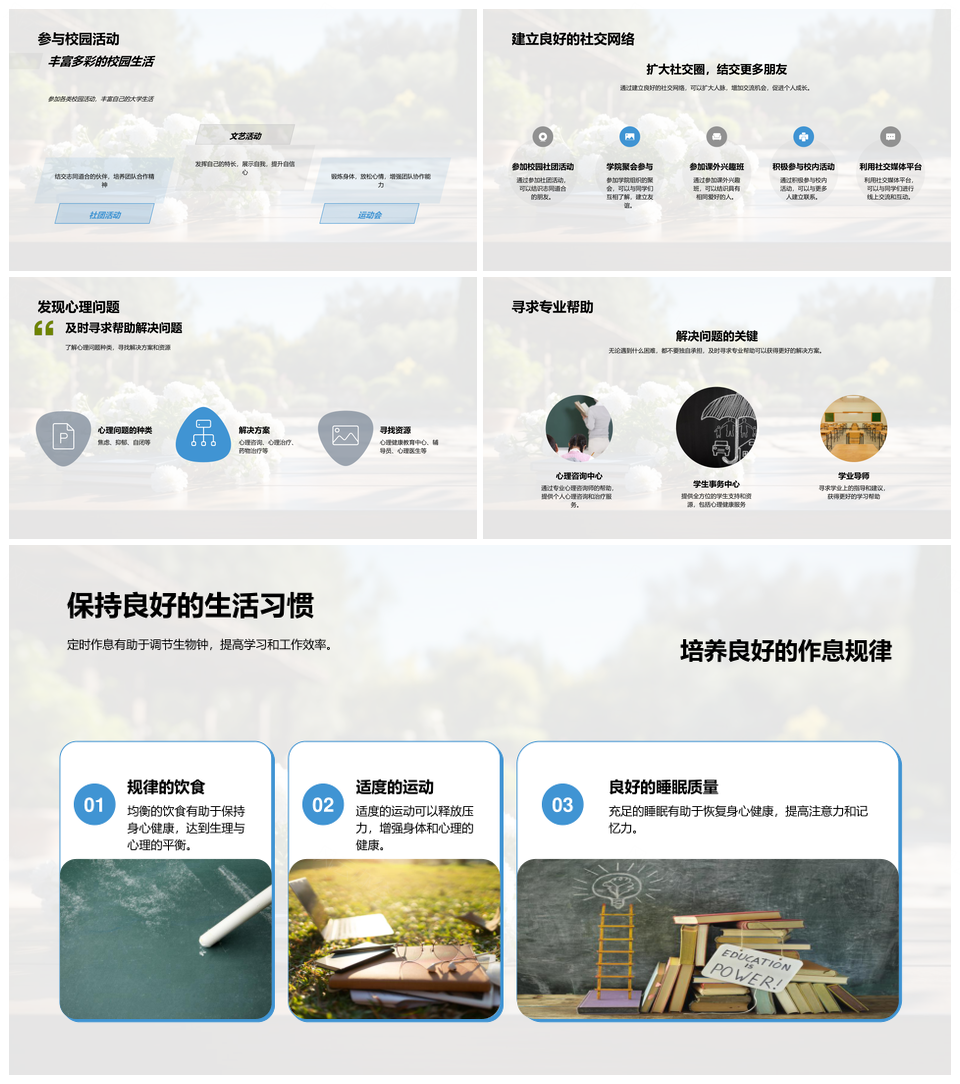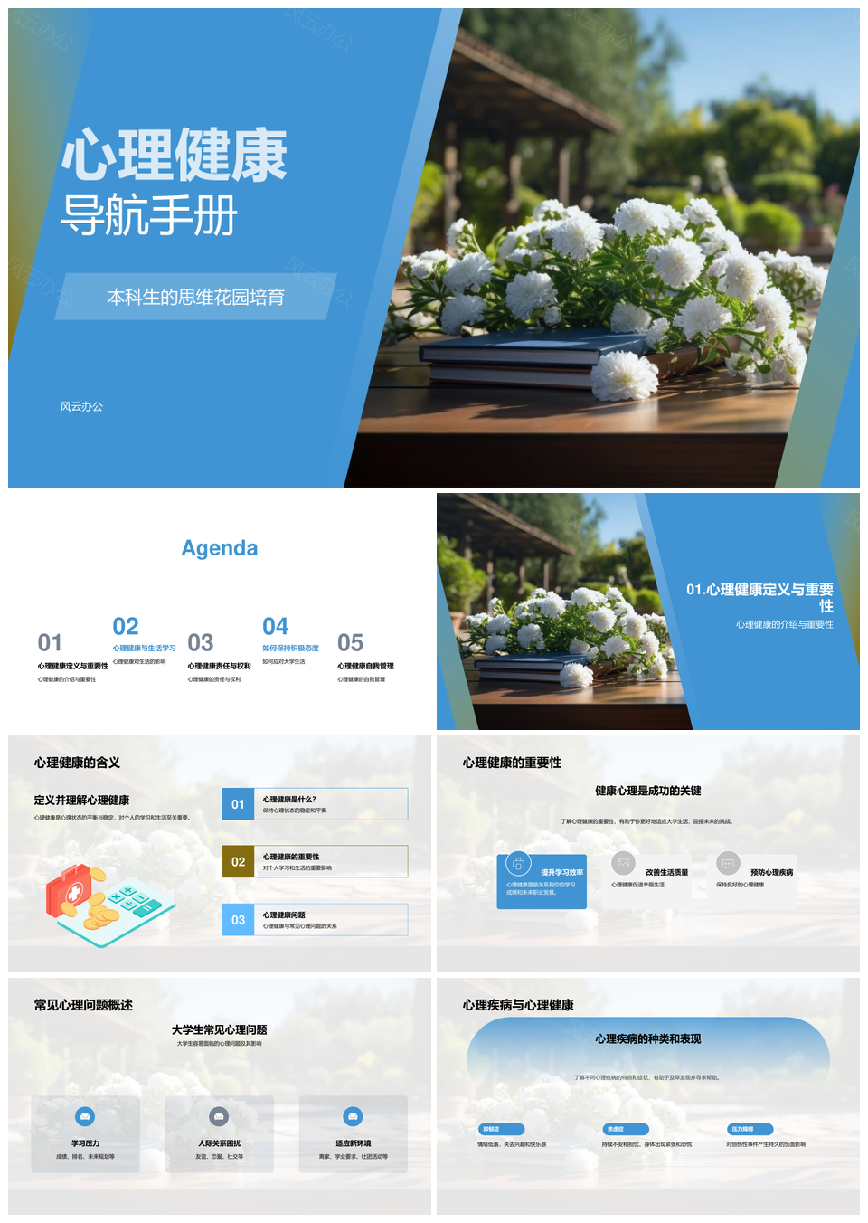 风云办公提供的本科生心理健康学习与人际交往指南书PPT模板,下载格式为pptx,一共33页,作品中文字及图均可以修改和编辑,图片更改请在作品中右键图片并更换,文字修改请直接点击文字进行修改。