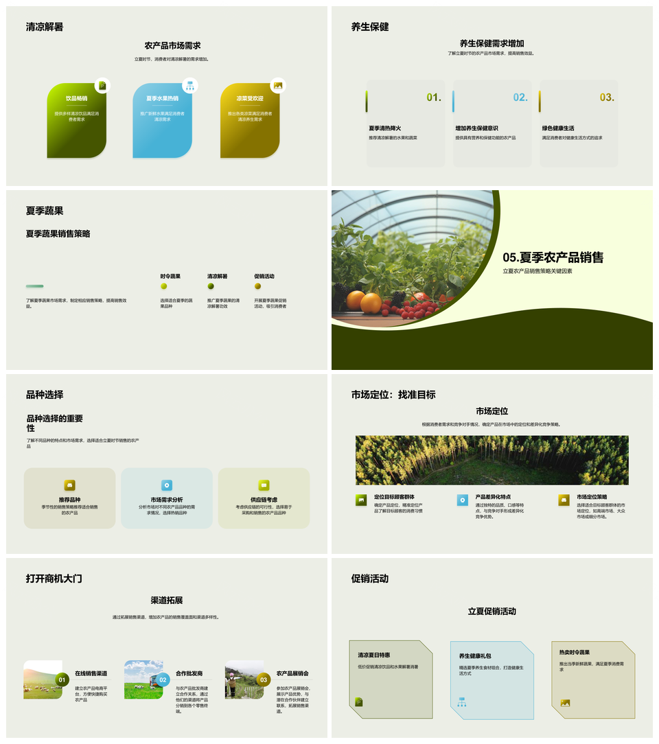 这是一张立夏高温多湿农产品经销商果蔬销售策略PPT模板,包含立夏、高温、多湿、农产品、经销商、果蔬、销售策略等主题内容,也可用作立夏高温多湿农产品、高温多湿农产品经销商、农产品经销商果蔬销售策略、立夏高温多湿经销商、高温多湿经销商果蔬、多湿农产品经销商果蔬、立夏农产品经销商果蔬、农产品果蔬销售策略、立夏高温多湿、高温多湿农产品、多湿农产品经销商、经销商果蔬销售策略、立夏高温、高温多湿、农产品经销商、果蔬销售策略等PPT场景使用。 风云办公提供的立夏高温多湿农产品经销商果蔬销售策略PPT模板,下载格式为pptx,一共26页,作品中文字及图均可以修改和编辑,图片更改请在作品中右键图片并更换,文字修改请直接点击文字进行修改。