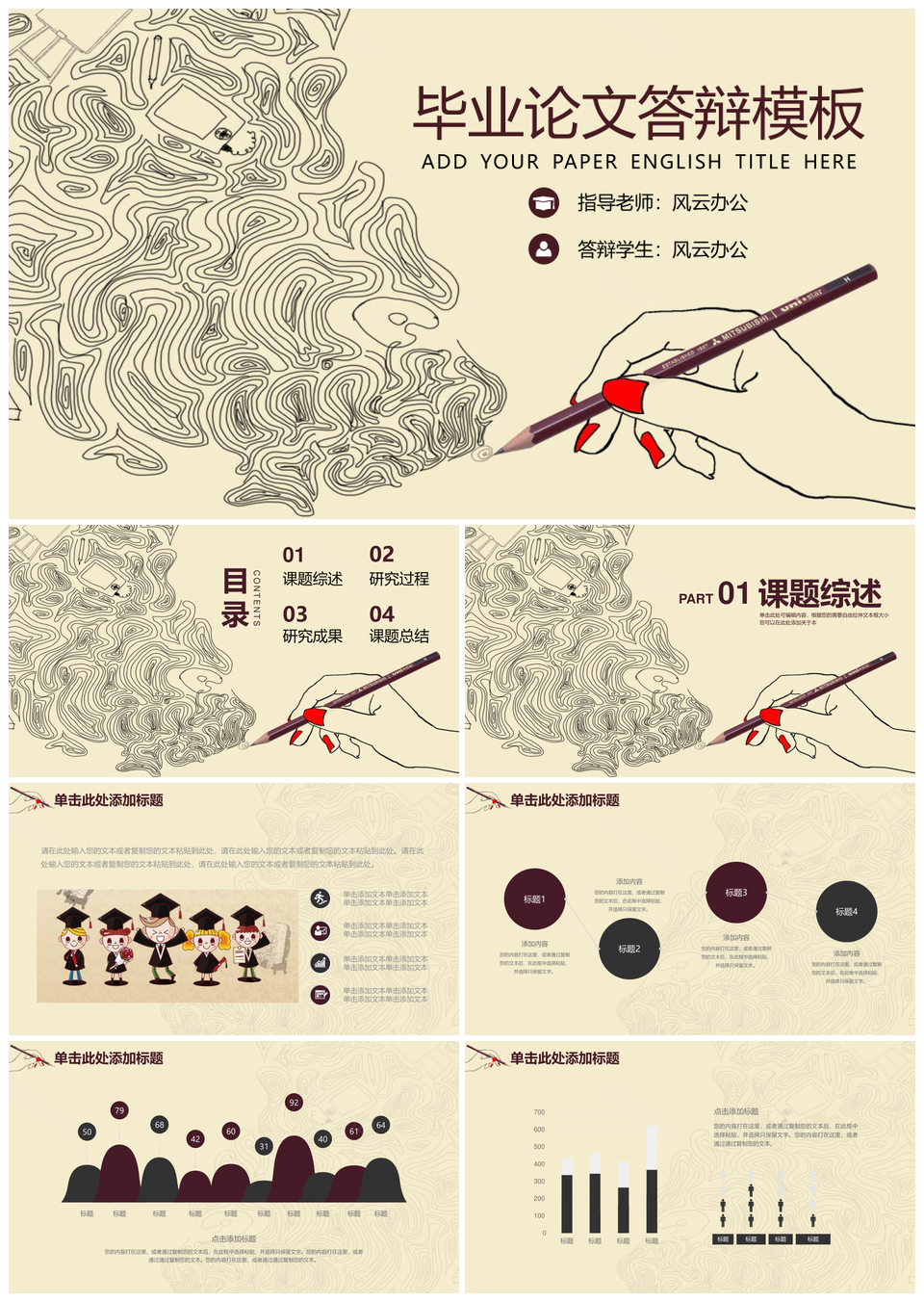 风云办公提供的手绘铅笔线稿线条简约答辩PPT模板,下载格式为pptx,一共33页,作品中文字及图均可以修改和编辑,图片更改请在作品中右键图片并更换,文字修改请直接点击文字进行修改。