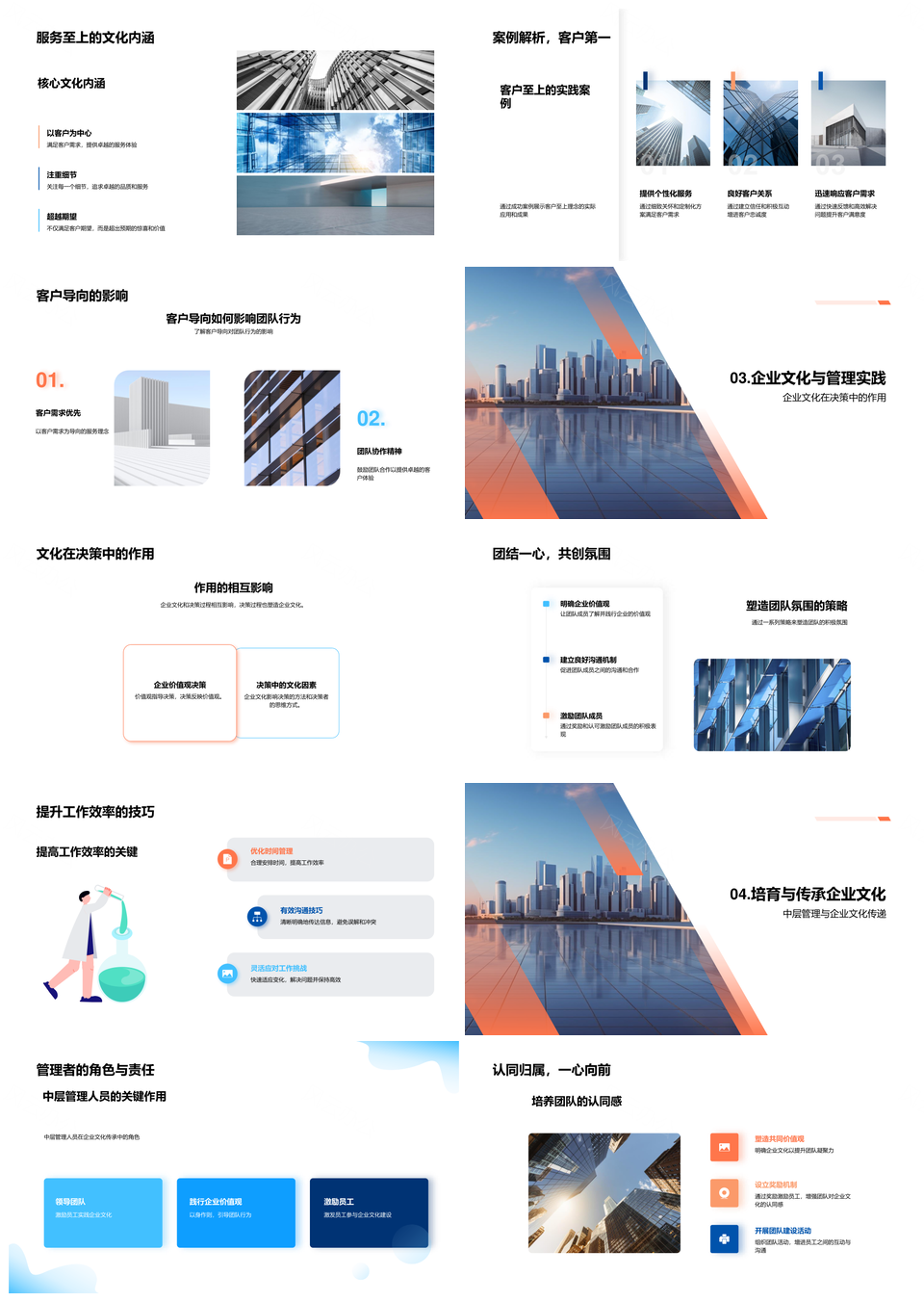 风云办公提供的企业文化引领高效服务团队管理实践PPT模板,下载格式为pptx,一共23页,作品中文字及图均可以修改和编辑,图片更改请在作品中右键图片并更换,文字修改请直接点击文字进行修改。