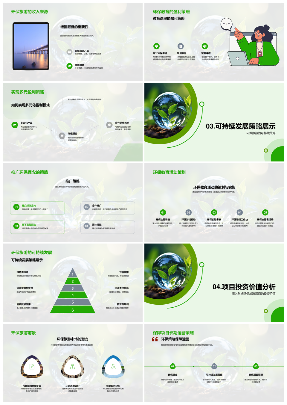 这是一张绿色旅游盈利模式驱动可持续投资教育增值PPT模板,包含绿色旅游、盈利模式、驱动、可持续、投资、教育、增值等主题内容,也可用作绿色旅游盈利模式、旅游盈利模式驱动、盈利模式驱动可持续、模式驱动可持续投资、驱动可持续投资教育、可持续投资教育增值、绿色旅游盈利模式驱动、旅游盈利模式驱动可持续、盈利模式驱动可持续投资、模式驱动可持续投资教育、驱动可持续投资教育增值、绿色旅游驱动可持续投资、绿色旅游盈利驱动投资、旅游盈利可持续教育增值、盈利模式投资教育增值等PPT场景使用。 风云办公提供的绿色旅游盈利模式驱动可持续投资教育增值PPT模板,下载格式为pptx,一共22页,作品中文字及图均可以修改和编辑,图片更改请在作品中右键图片并更换,文字修改请直接点击文字进行修改。