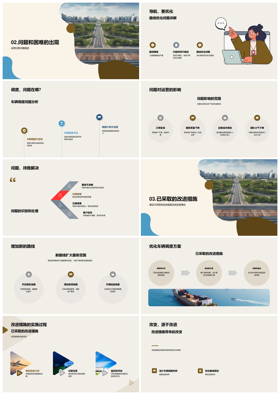 这是一张城市交通车辆调度路线优化与运营改进策略PPT模板,包含城市交通、车辆调度、路线优化、运营改进、策略等主题内容,也可用作城市交通车辆调度路线优化运营改进策略、城市交通车辆调度路线优化、交通车辆调度路线优化运营、车辆调度路线优化运营改进、调度路线优化运营改进策略、路线优化运营改进策略、优化运营改进策略、城市交通车辆调度路线、交通车辆调度路线优化、车辆调度路线优化运营、调度路线优化运营改进、路线优化运营改进策略、交通车辆调度路线优化运营改进策略、运营改进策略、车辆调度路线优化等PPT场景使用。 风云办公提供的城市交通车辆调度路线优化与运营改进策略PPT模板,下载格式为pptx,一共28页,作品中文字及图均可以修改和编辑,图片更改请在作品中右键图片并更换,文字修改请直接点击文字进行修改。