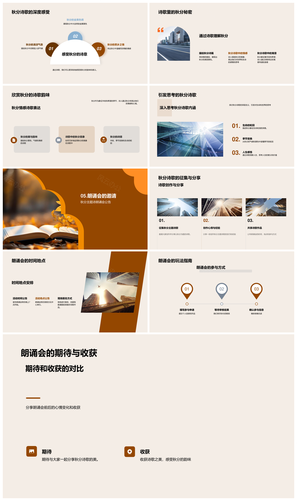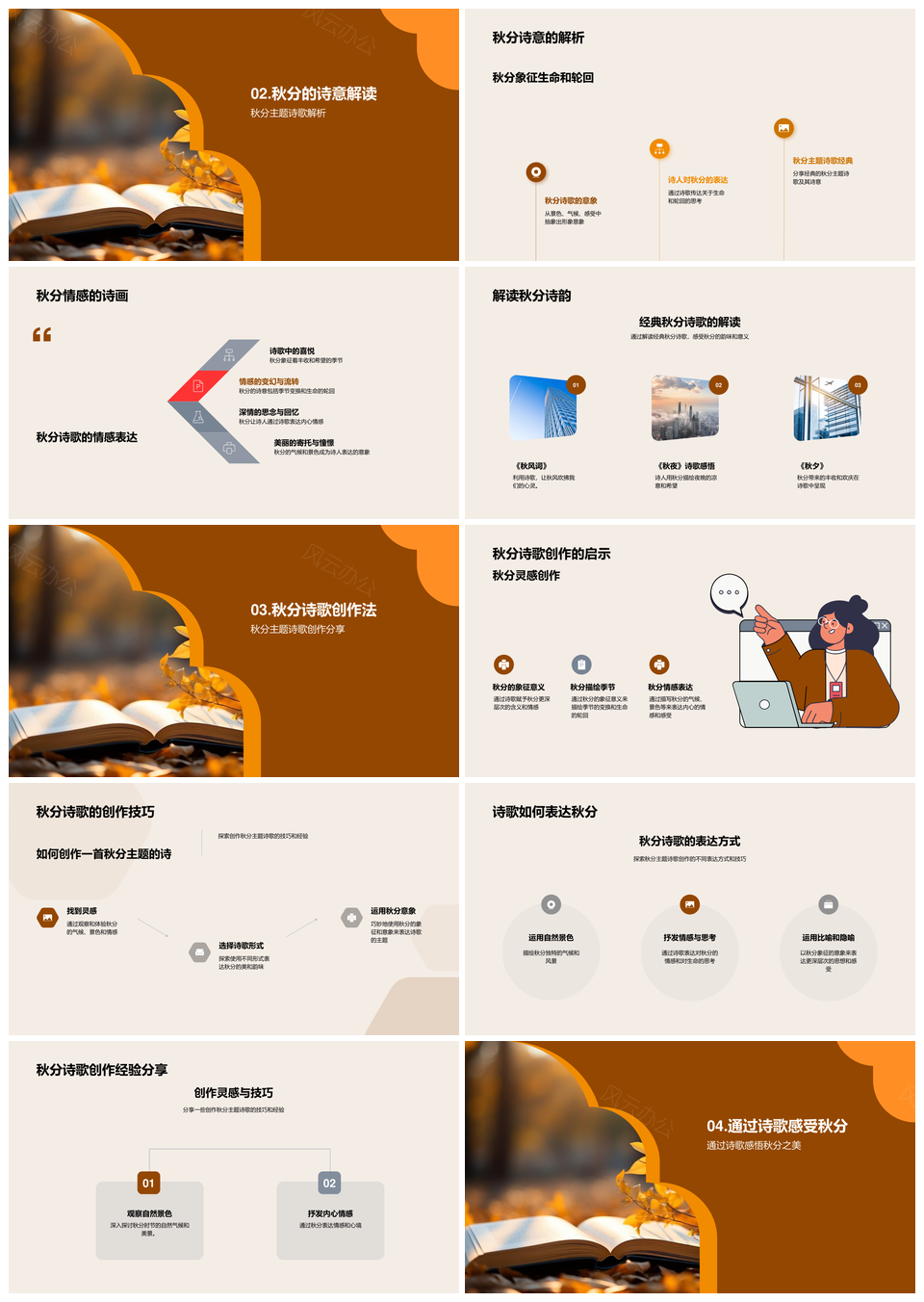 风云办公提供的诗意秋分诗歌创作与季节之诗解析PPT模板,下载格式为pptx,一共27页,作品中文字及图均可以修改和编辑,图片更改请在作品中右键图片并更换,文字修改请直接点击文字进行修改。