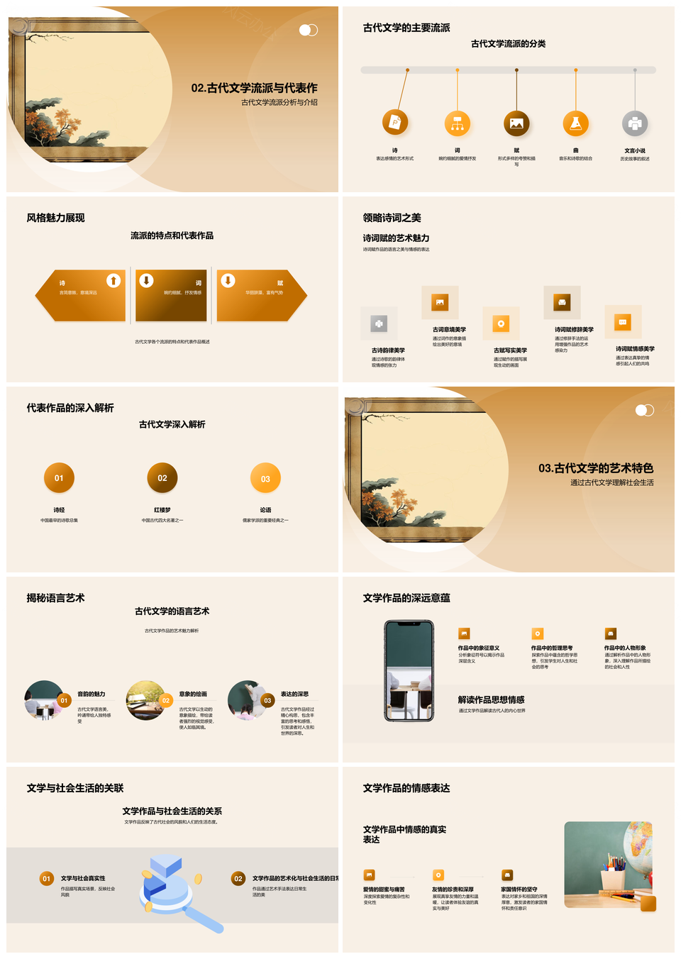 风云办公提供的古代文学流派艺术魅力与社会生活探秘PPT模板,下载格式为pptx,一共28页,作品中文字及图均可以修改和编辑,图片更改请在作品中右键图片并更换,文字修改请直接点击文字进行修改。