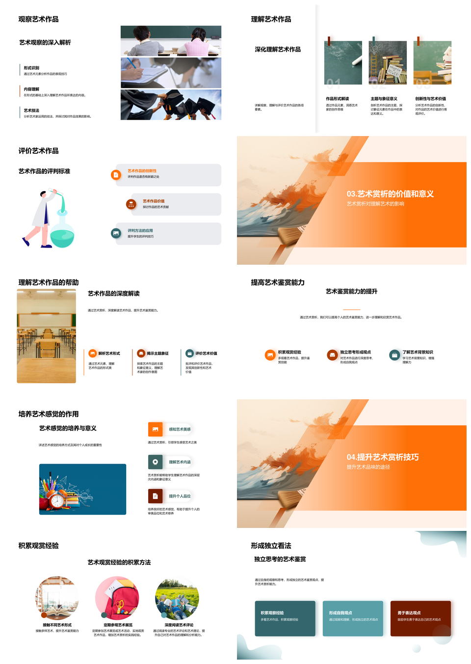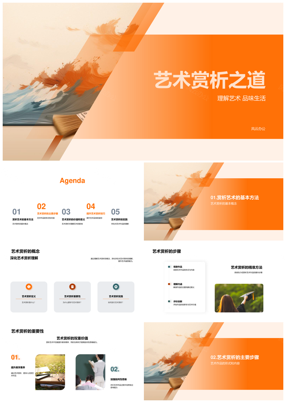 风云办公提供的艺术赏析观察理解提升鉴赏品味生活PPT模板,下载格式为pptx,一共24页,作品中文字及图均可以修改和编辑,图片更改请在作品中右键图片并更换,文字修改请直接点击文字进行修改。