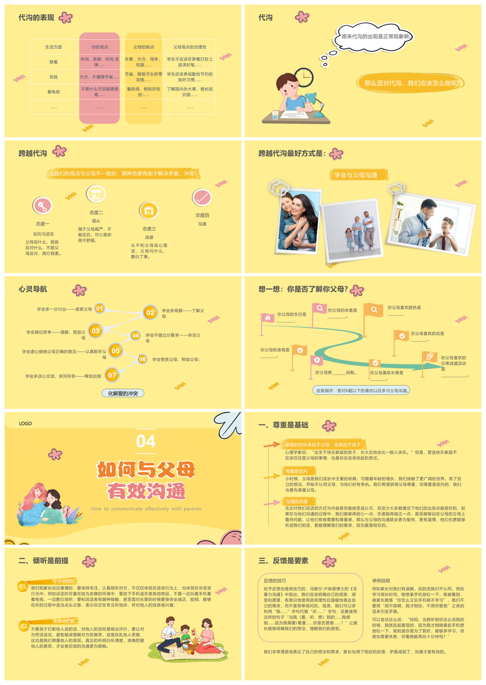 2025青少年亲子高效沟通技巧淡黄插画心理PPT模板