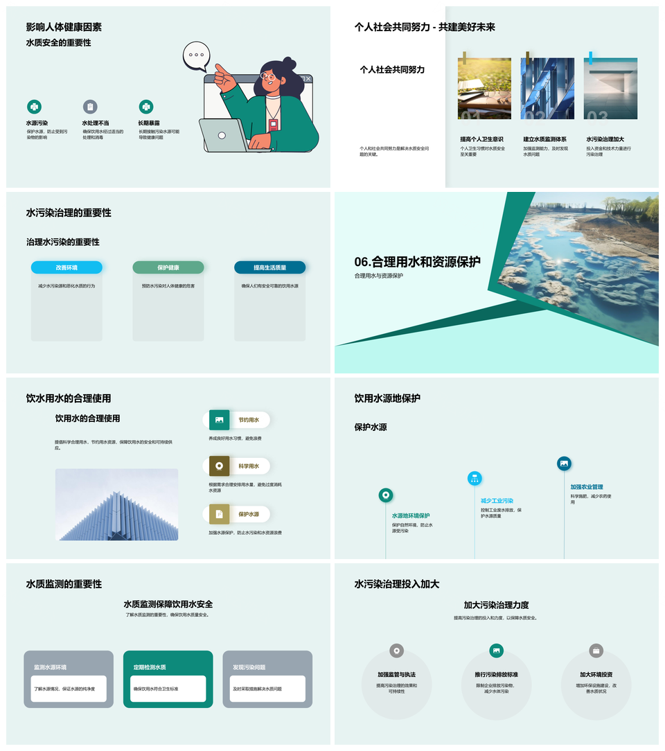 这是一张水质检测护饮水安全克污染致病风险PPT模板,包含水质检测、饮水安全、污染、致病风险等主题内容,也可用作水质检测饮水安全污染致病风险、水质检测饮水安全污染、水质检测饮水安全致病风险、水质检测污染致病风险、饮水安全污染致病风险、水质检测饮水安全、水质检测污染、水质检测致病风险、饮水安全污染、饮水安全致病风险、污染致病风险、污染水质检测、致病风险水质检测、污染饮水安全、饮水安全水质检测等PPT场景使用。