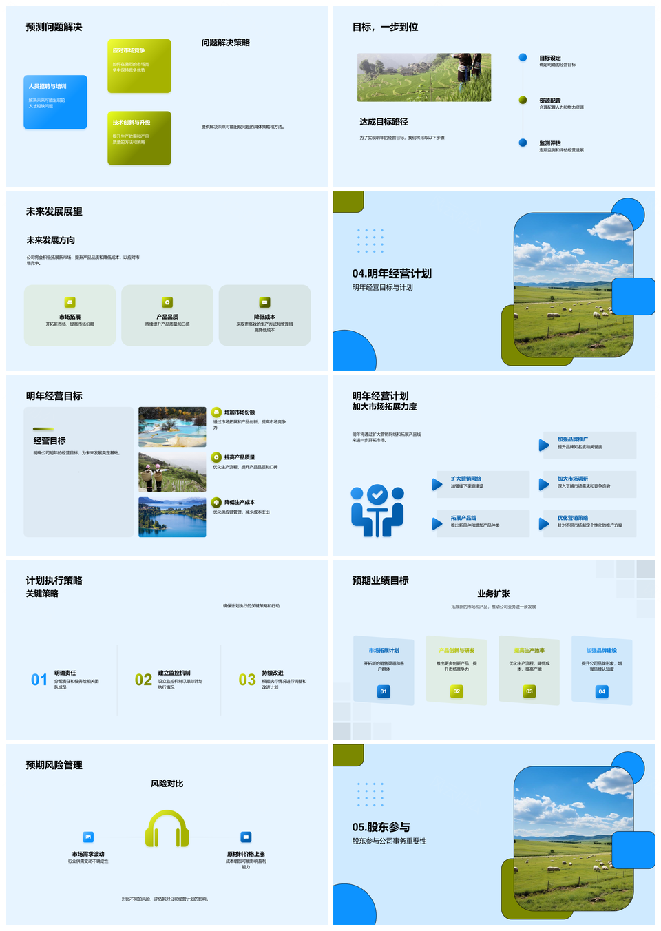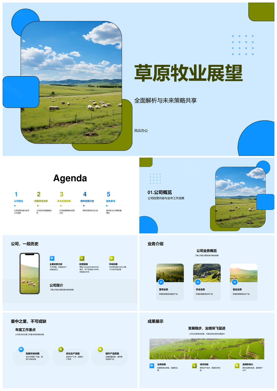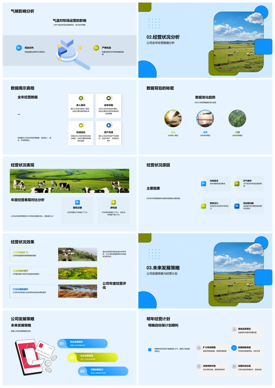 风云办公提供的草原牧业年度经营策略与气候应对计划PPT模板,下载格式为pptx,一共33页,作品中文字及图均可以修改和编辑,图片更改请在作品中右键图片并更换,文字修改请直接点击文字进行修改。
