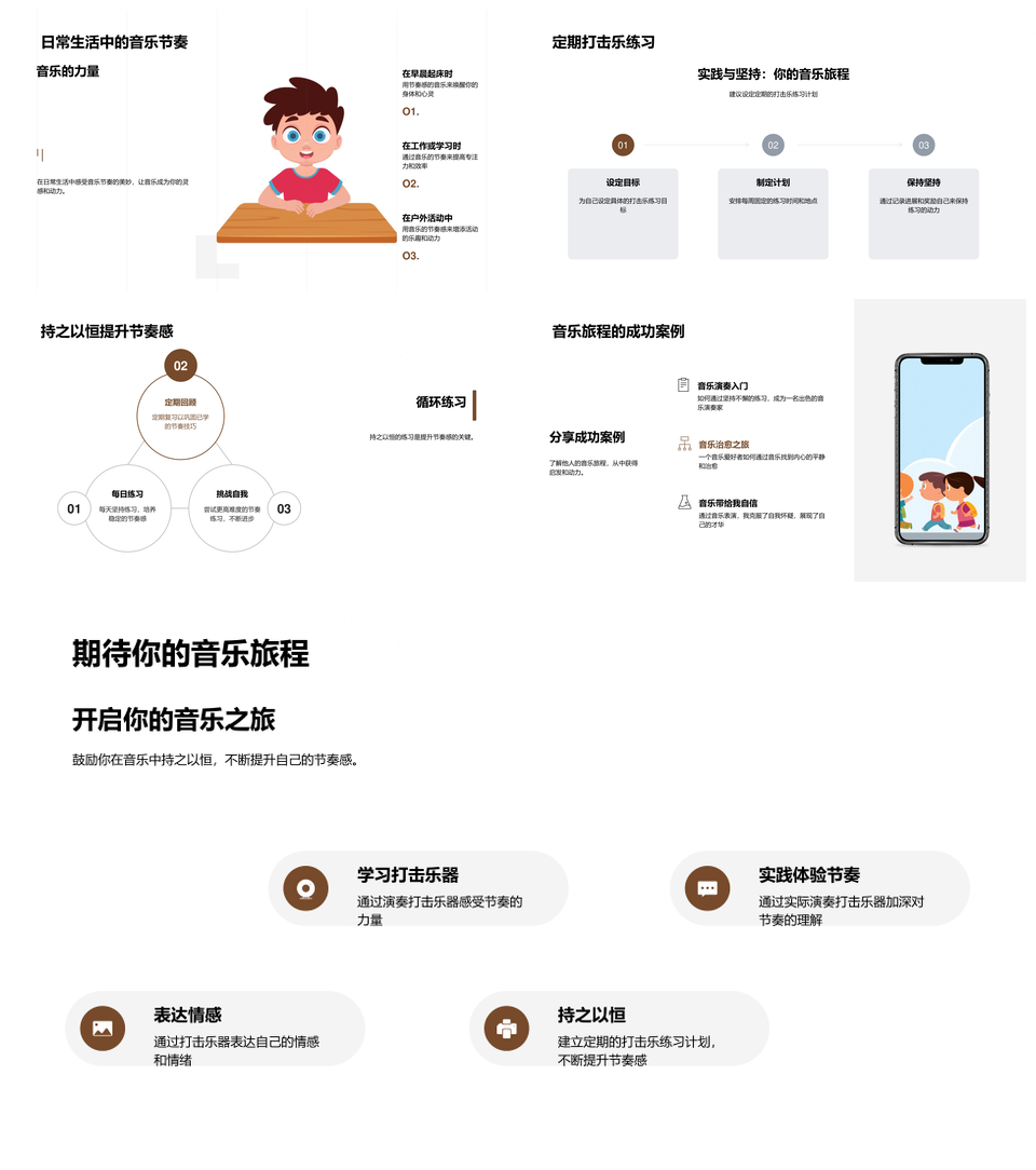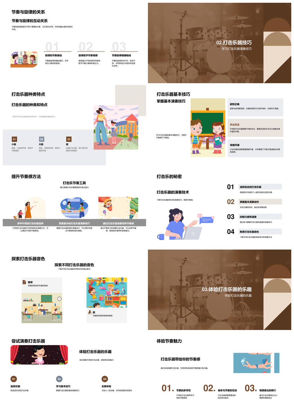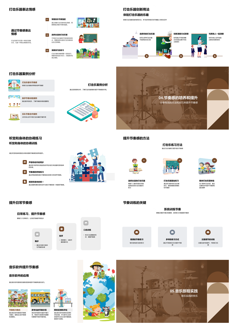 风云办公提供的打击乐器演奏创作提升节奏之美PPT模板,下载格式为pptx,一共33页,作品中文字及图均可以修改和编辑,图片更改请在作品中右键图片并更换,文字修改请直接点击文字进行修改。