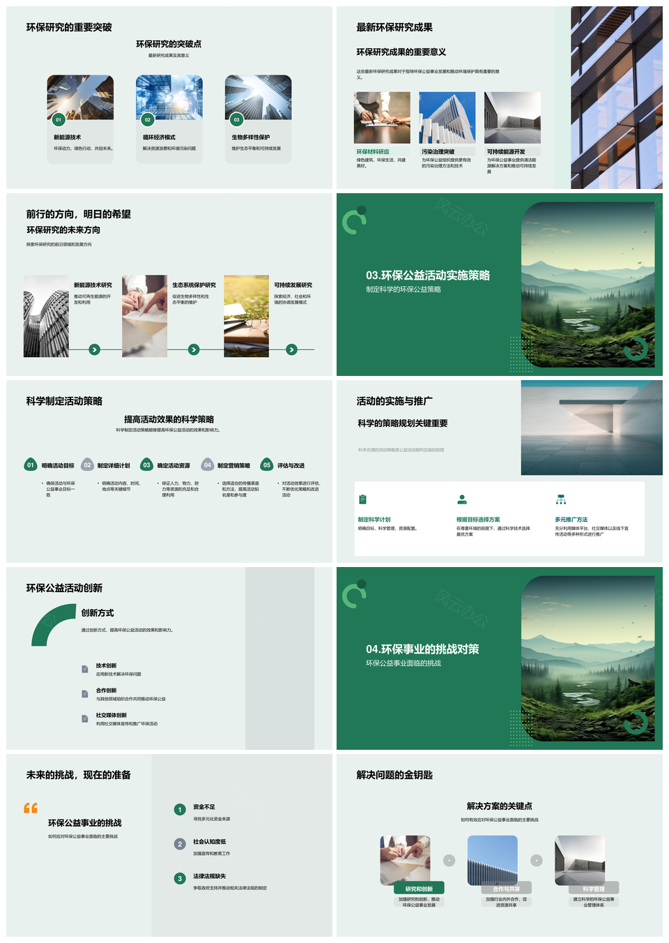 这款模板专为商务场景设计,采用墨绿、浅绿与草绿构建严谨的色彩系统,适配工作汇报、项目提案等专业场景。版面融合自然枝叶元素与几何纹理,通过适度的留白与清晰的信息层级,打造冷静理性的视觉呈现。模块化结构支持快速修改,页面逻辑框架完整覆盖职场演示需求。日系设计手法弱化商务材料的刻板印象,用低饱和渐变色维持专业基调的同时,融入森林系特有的舒缓感,帮助演讲者营造专注不失温度的沟通氛围。