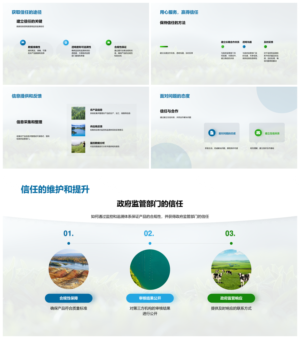 这是一张农产品质量追溯监控体系智能合规安全第三方审核PPT模板,包含农产品、质量、追溯、监控体系、智能、合规、安全、第三方、审核等主题内容,也可用作农产品质量追溯监控体系、质量追溯监控体系智能、追溯监控体系智能合规、监控体系智能合规安全、体系智能合规安全第三方、智能合规安全第三方审核、农产品质量追溯监控、质量追溯监控体系、追溯监控体系智能、监控体系智能合规、体系智能合规安全、智能合规安全第三方、合规安全第三方审核、农产品质量追溯、质量追溯监控、追溯监控体系等PPT场景使用。 风云办公提供的农产品质量追溯监控体系智能合规安全第三方审核PPT模板,下载格式为pptx,一共33页,作品中文字及图均可以修改和编辑,图片更改请在作品中右键图片并更换,文字修改请直接点击文字进行修改。