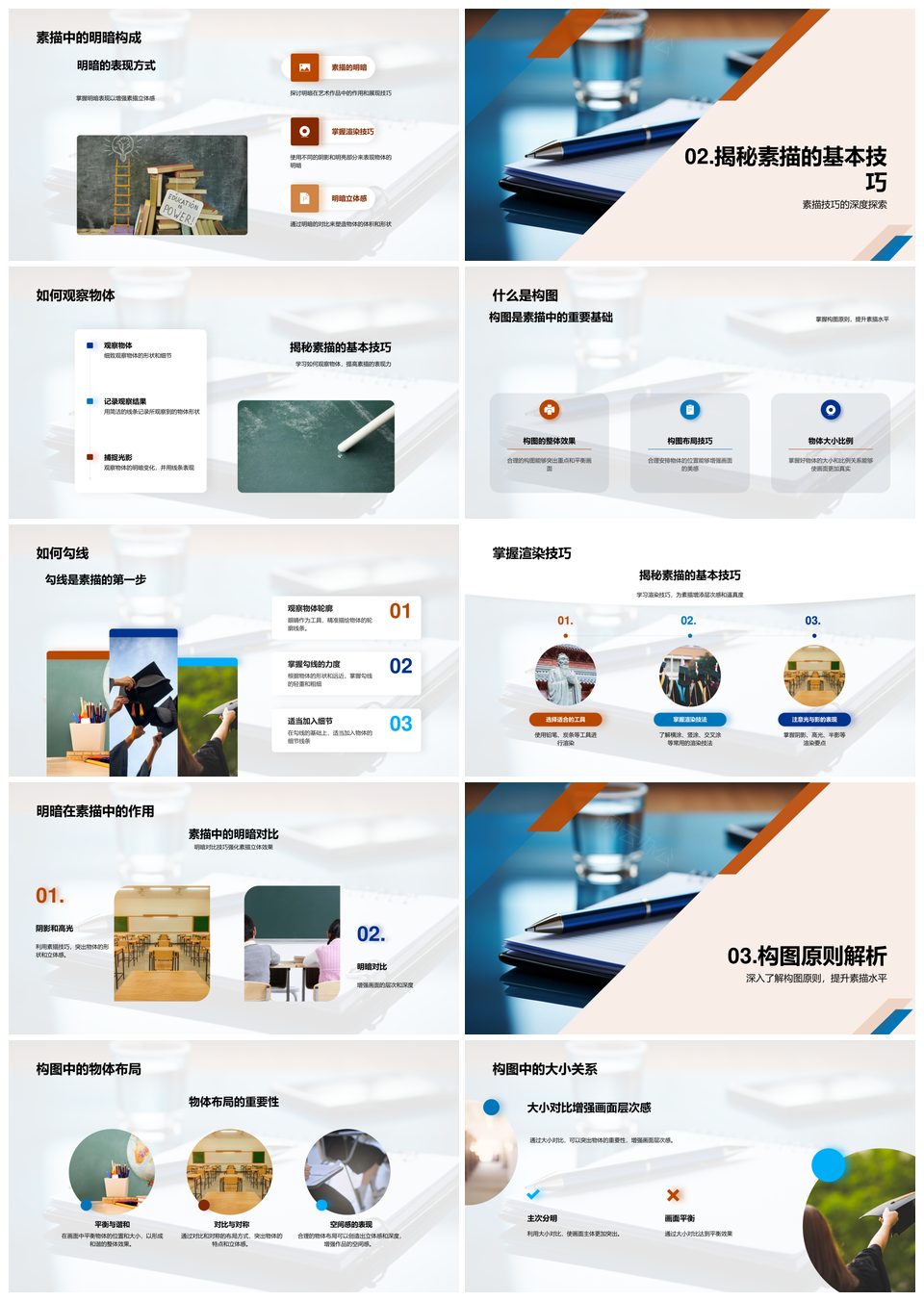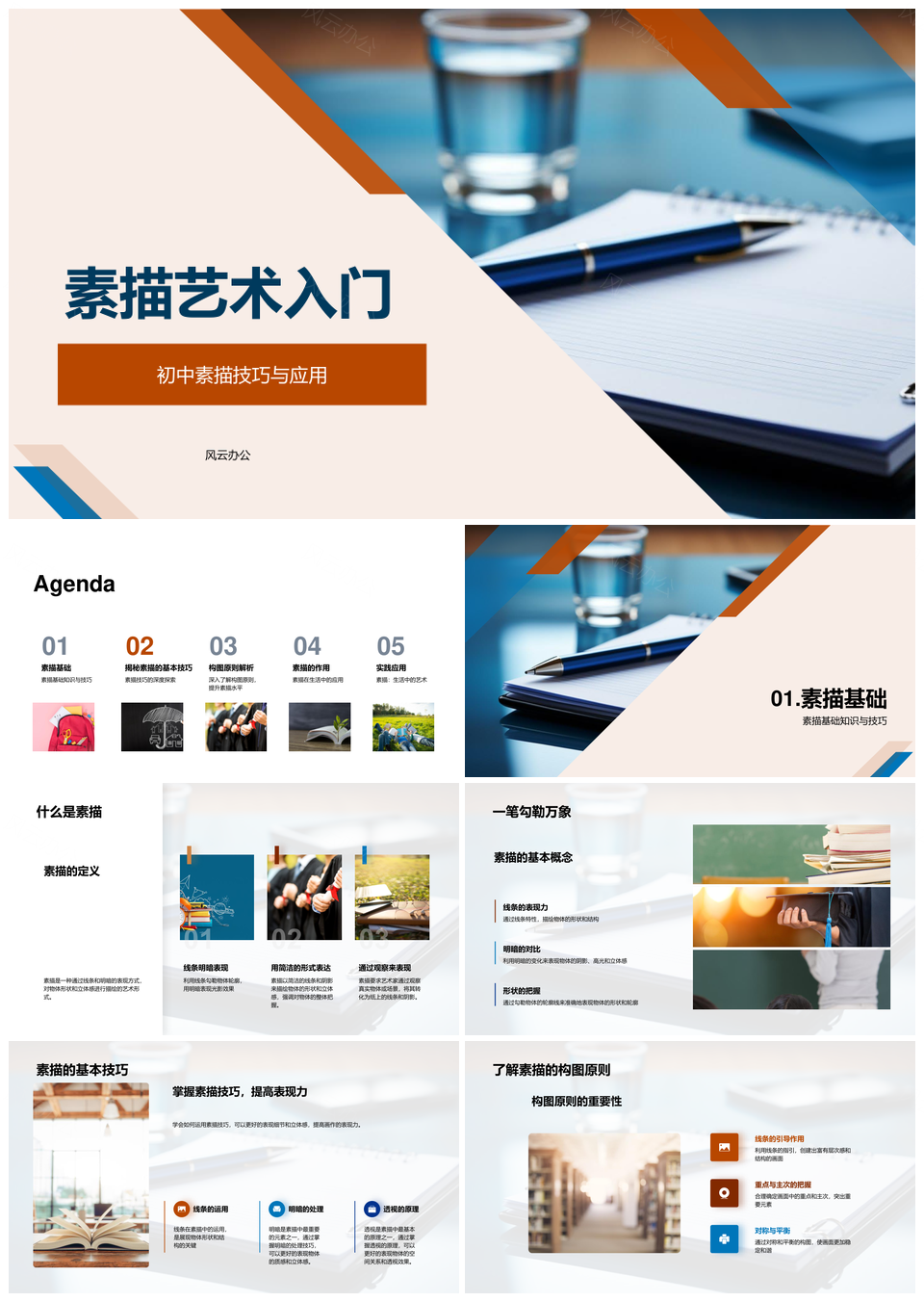 风云办公提供的素描艺术入门基础构图勾线技巧解析PPT模板,下载格式为pptx,一共33页,作品中文字及图均可以修改和编辑,图片更改请在作品中右键图片并更换,文字修改请直接点击文字进行修改。