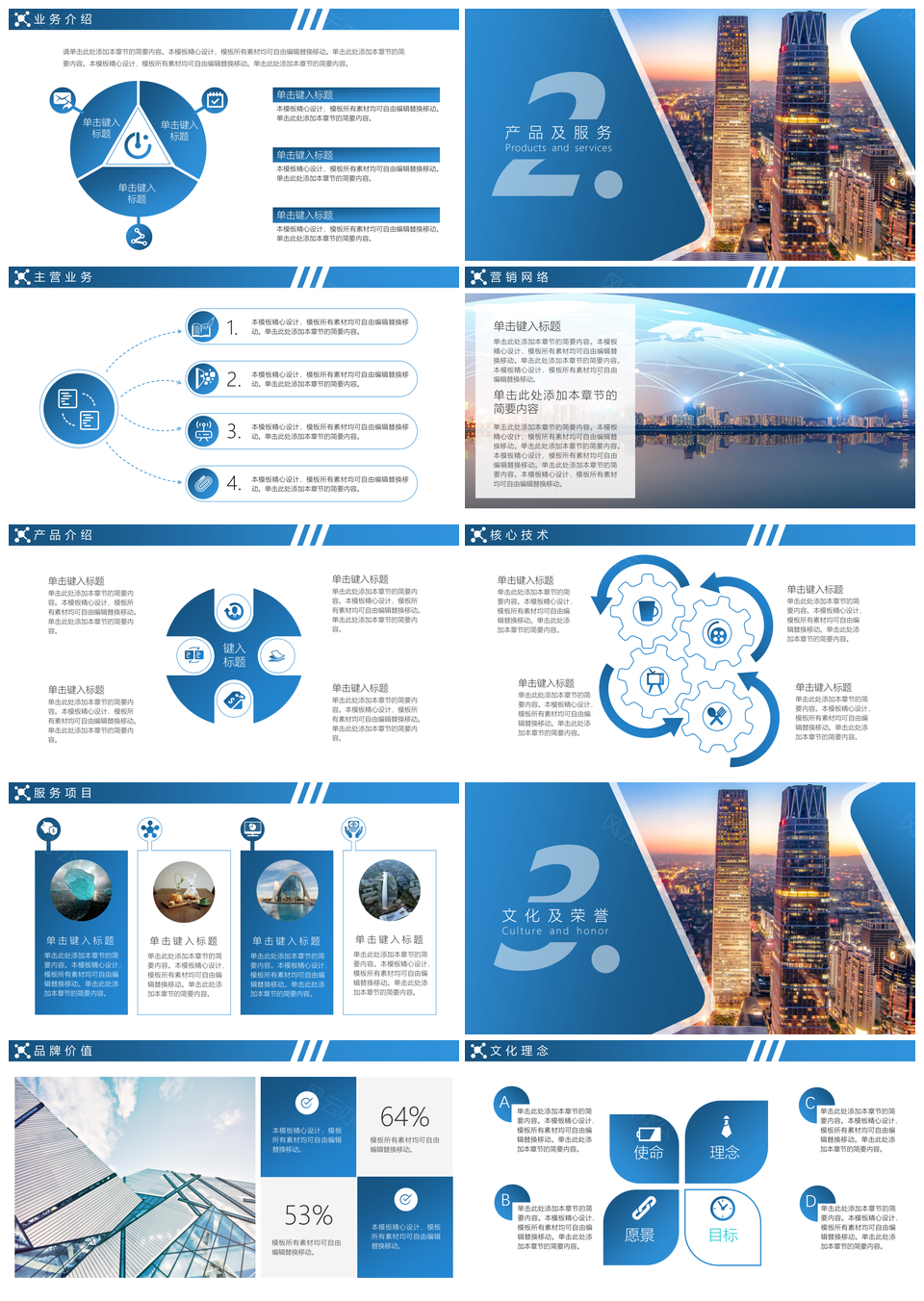 风云办公提供的商务风蓝色公司简介企业宣传画册PPT模板,下载格式为pptx,一共26页,作品中文字及图均可以修改和编辑,图片更改请在作品中右键图片并更换,文字修改请直接点击文字进行修改。
