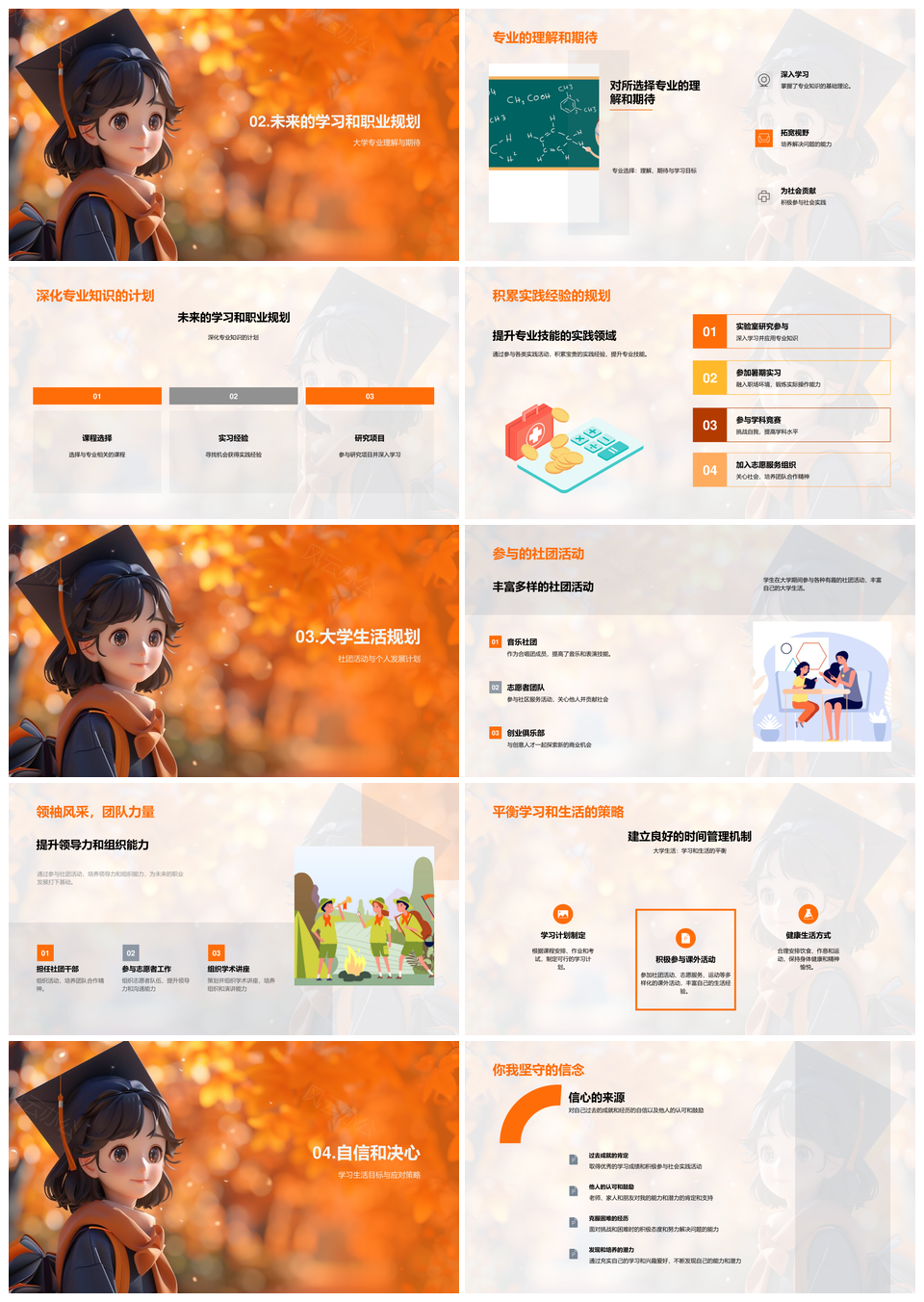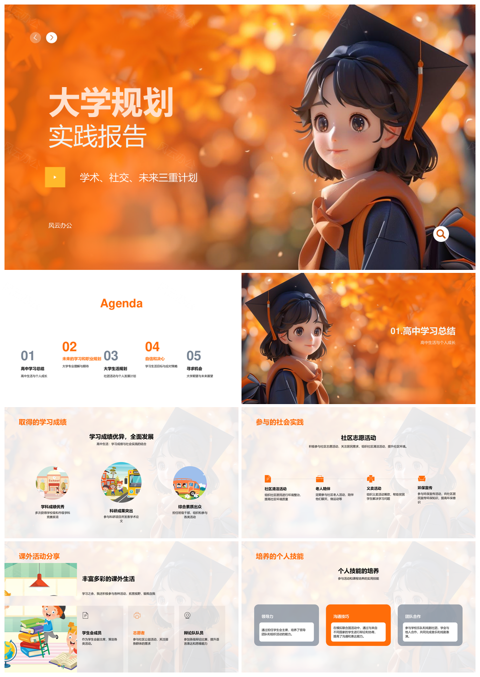 风云办公提供的大学规划实践学术社交未来成果领导力PPT模板,下载格式为pptx,一共24页,作品中文字及图均可以修改和编辑,图片更改请在作品中右键图片并更换,文字修改请直接点击文字进行修改。