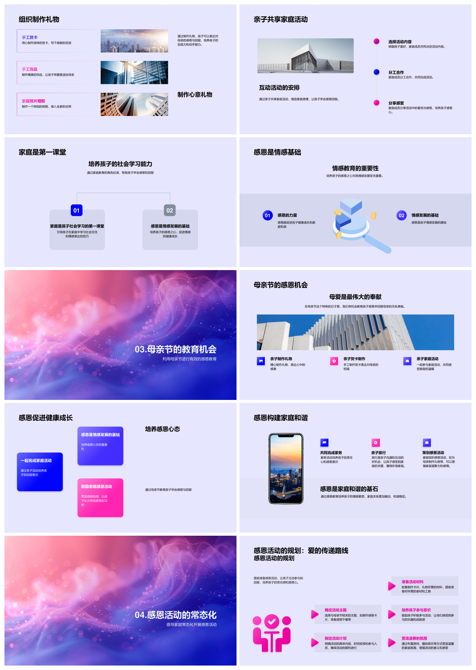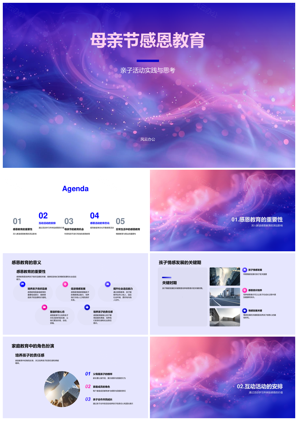 风云办公提供的母亲节亲子活动感恩教育意义PPT模板,下载格式为pptx,一共24页,作品中文字及图均可以修改和编辑,图片更改请在作品中右键图片并更换,文字修改请直接点击文字进行修改。