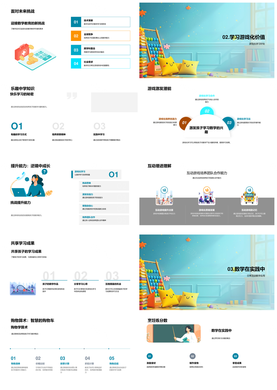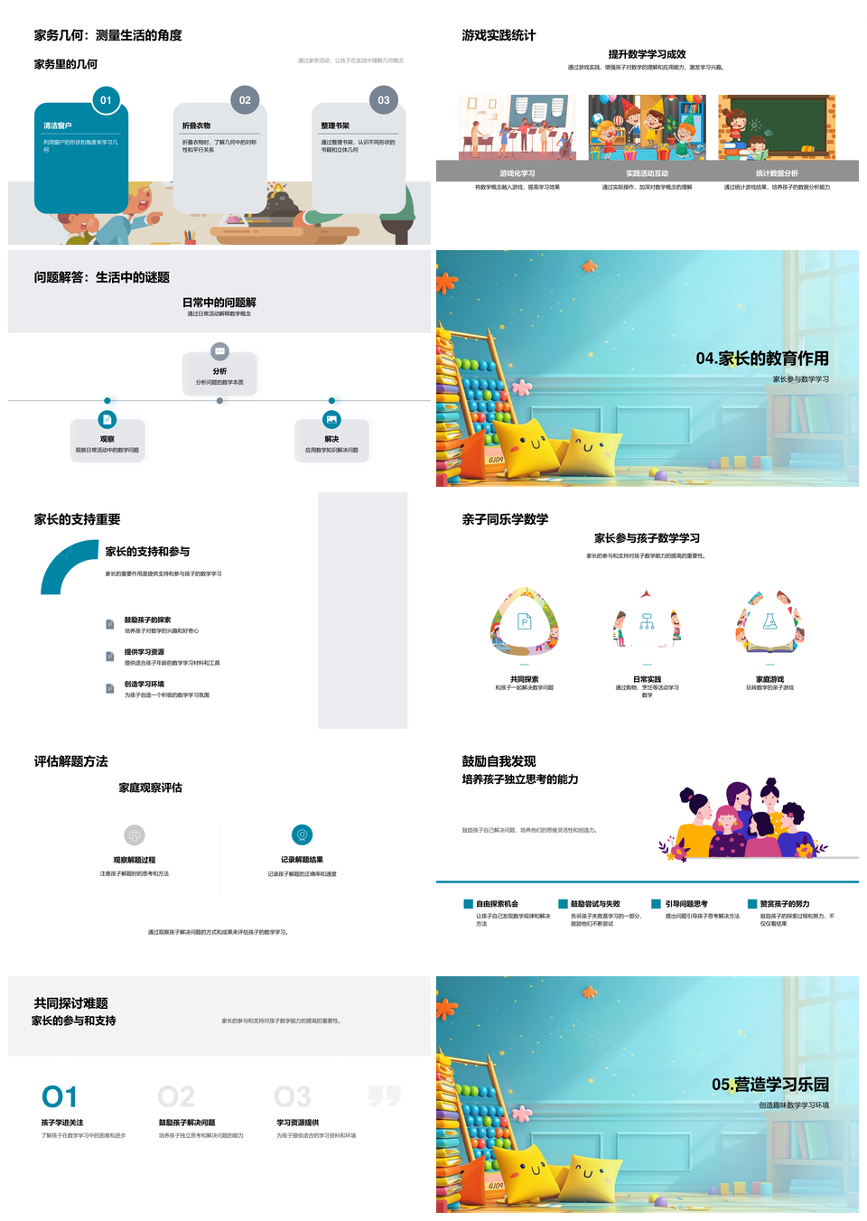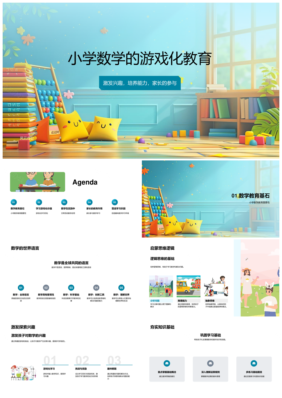 风云办公提供的小学数学游戏化教育家长实践课件,下载格式为pptx,一共33页,作品中文字及图均可以修改和编辑,图片更改请在作品中右键图片并更换,文字修改请直接点击文字进行修改。