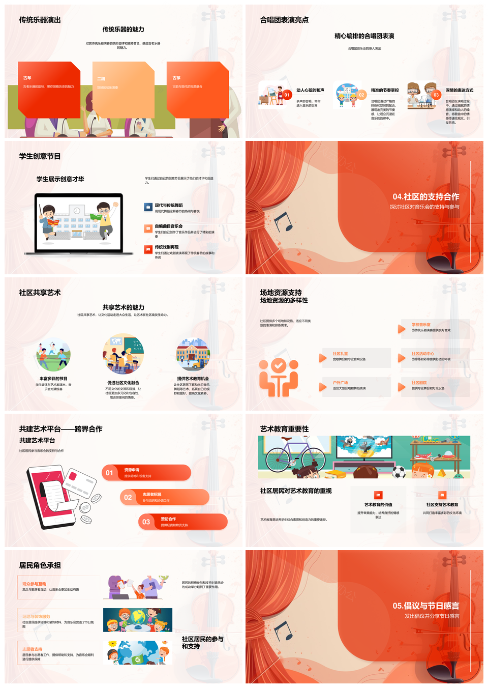 风云办公提供的春节学生传统艺术教育社区音乐会PPT模板,下载格式为pptx,一共33页,作品中文字及图均可以修改和编辑,图片更改请在作品中右键图片并更换,文字修改请直接点击文字进行修改。