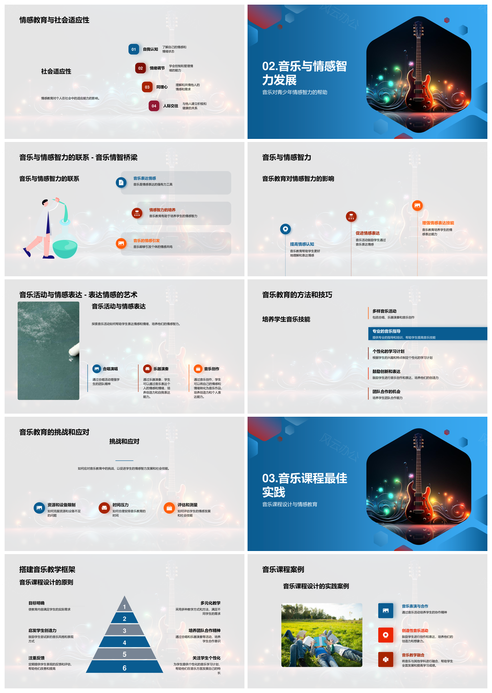 风云办公提供的音乐教育促进青少年情智发展PPT模板,下载格式为pptx,一共33页,作品中文字及图均可以修改和编辑,图片更改请在作品中右键图片并更换,文字修改请直接点击文字进行修改。