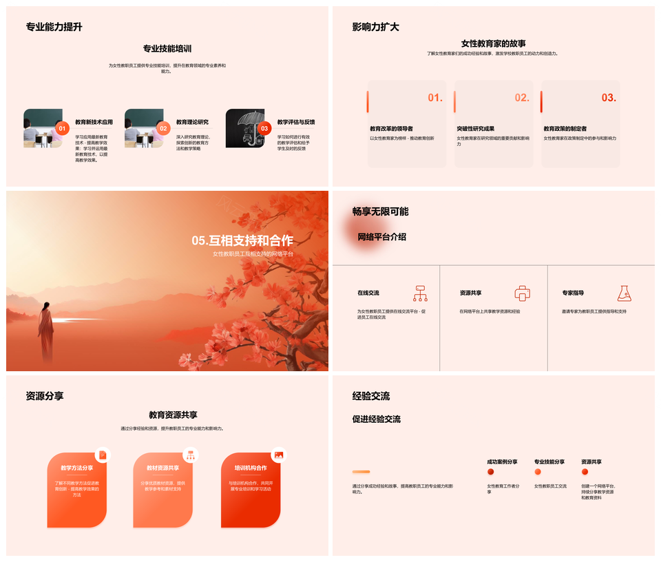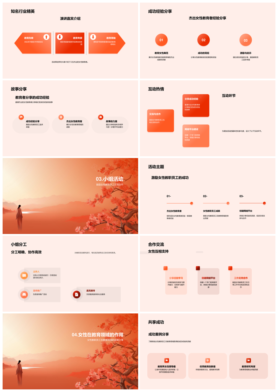 这是一张妇女节女教职工成就贡献分享特别活动策划PPT模板,包含妇女节、女教职工、成就、贡献、分享、特别活动、策划等主题内容,也可用作妇女节女教职工成就贡献分享、妇女节女教职工成就分享特别活动、女教职工成就贡献分享特别活动、成就贡献分享特别活动策划、妇女节女教职工成就贡献、妇女节女教职工贡献分享、女教职工成就贡献分享、成就贡献分享特别活动、妇女节特别活动策划、贡献分享特别活动策划、女教职工成就贡献、成就分享特别活动、贡献分享特别活动、特别活动策划、妇女节女教职工等PPT场景使用。 风云办公提供的妇女节女教职工成就贡献分享特别活动策划PPT模板,下载格式为pptx,一共24页,作品中文字及图均可以修改和编辑,图片更改请在作品中右键图片并更换,文字修改请直接点击文字进行修改。
