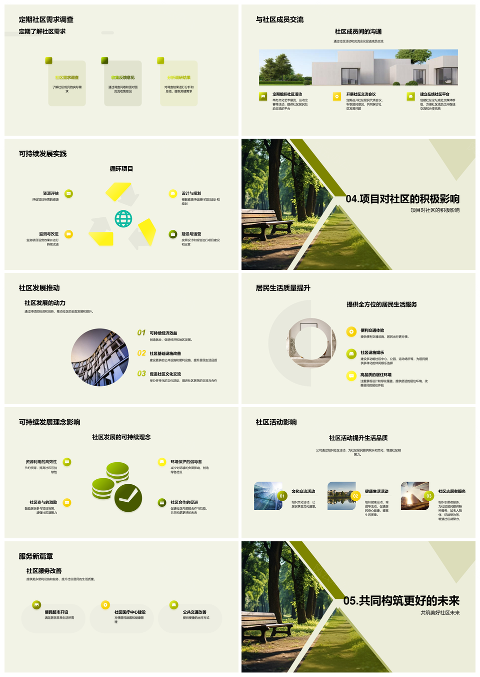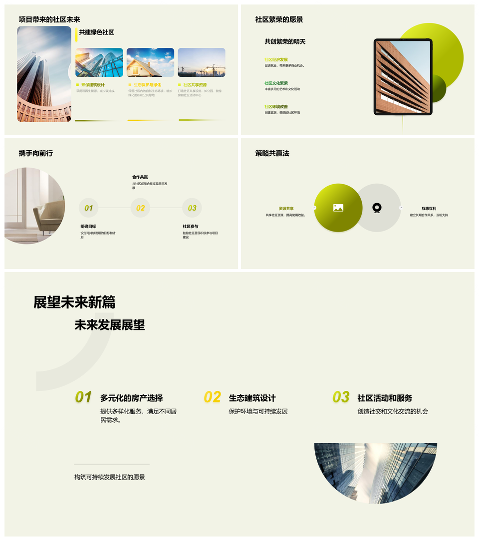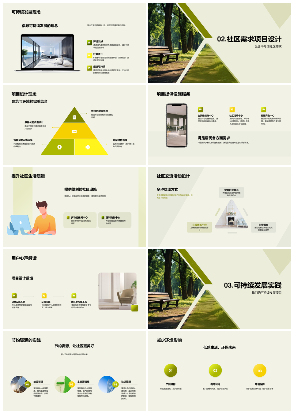 这是一张绿色可持续社区发展房地产建设项目设计PPT模板,包含绿色、可持续、社区、发展、房地产、建设、项目、设计等主题内容,也可用作绿色可持续社区发展、可持续社区发展房地产、社区发展房地产建设、发展房地产建设项目、房地产建设项目设计、绿色可持续社区、可持续社区发展、社区发展房地产、发展房地产建设、房地产建设项目、建设项目设计、绿色可持续、可持续社区、社区发展、发展房地产等PPT场景使用。 风云办公提供的绿色可持续社区发展房地产建设项目设计PPT模板,下载格式为pptx,一共33页,作品中文字及图均可以修改和编辑,图片更改请在作品中右键图片并更换,文字修改请直接点击文字进行修改。