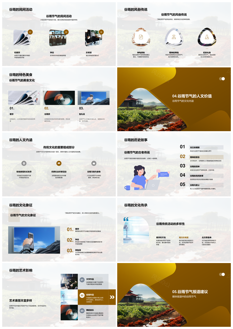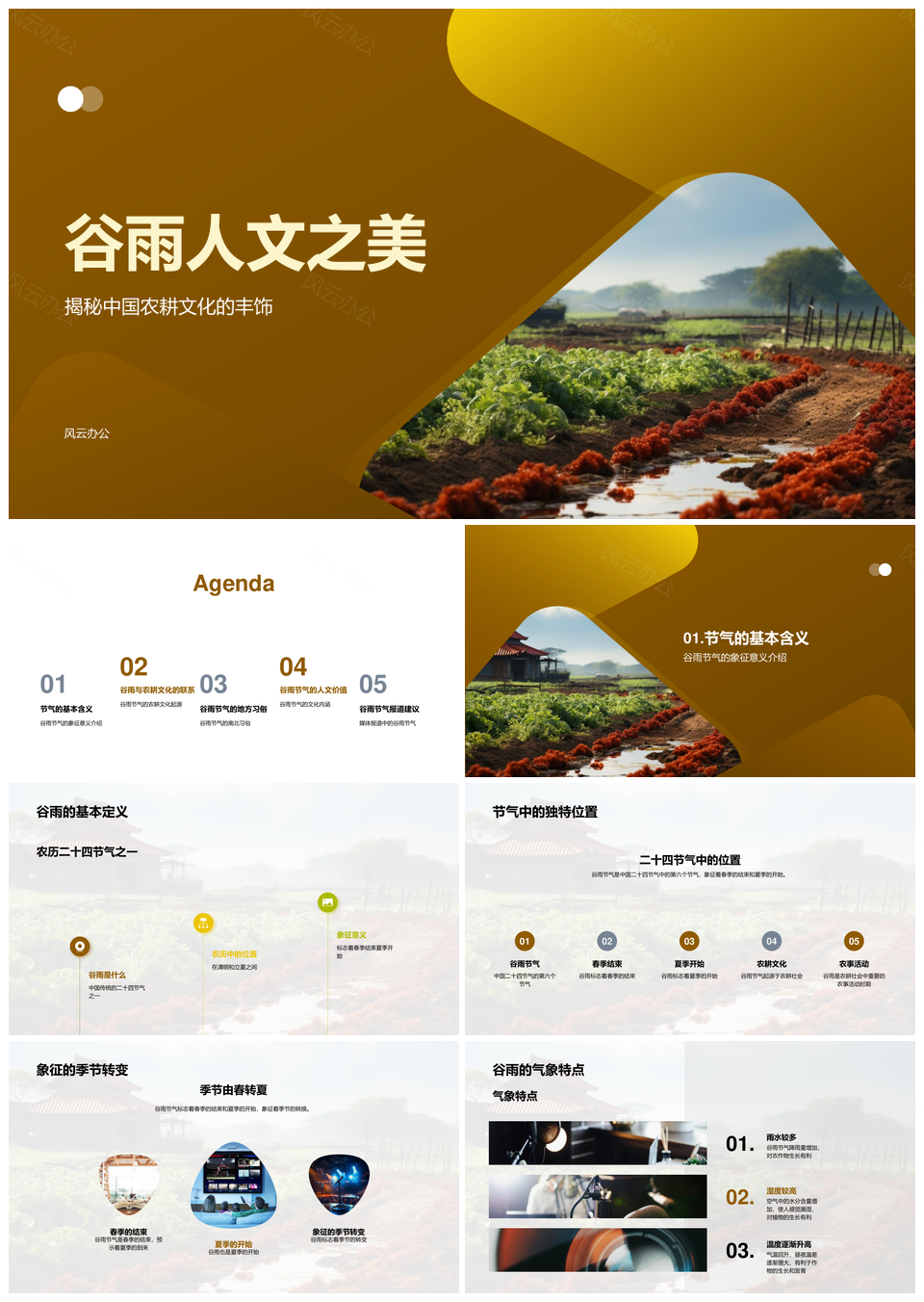 风云办公提供的谷雨农耕文化二十四节气人文传统PPT模板,下载格式为pptx,一共33页,作品中文字及图均可以修改和编辑,图片更改请在作品中右键图片并更换,文字修改请直接点击文字进行修改。