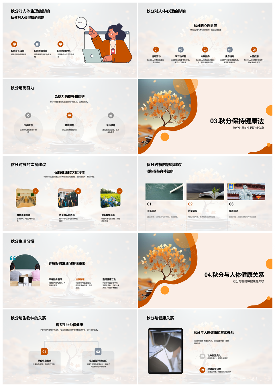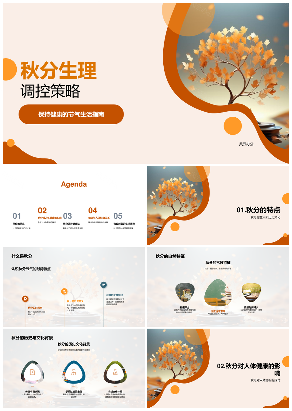 风云办公提供的秋分节气生理调节健康养生指南PPT模板,下载格式为pptx,一共23页,作品中文字及图均可以修改和编辑,图片更改请在作品中右键图片并更换,文字修改请直接点击文字进行修改。