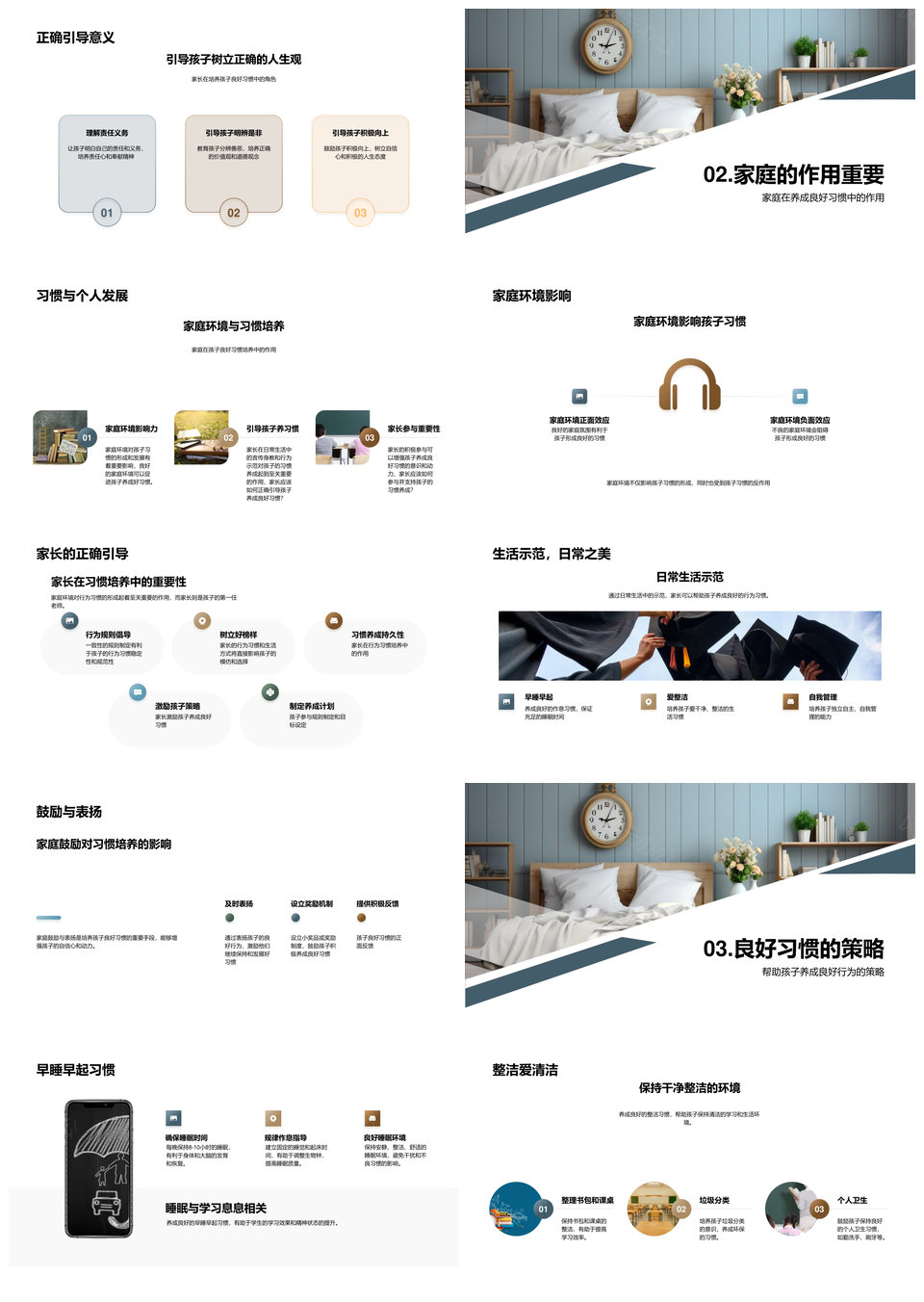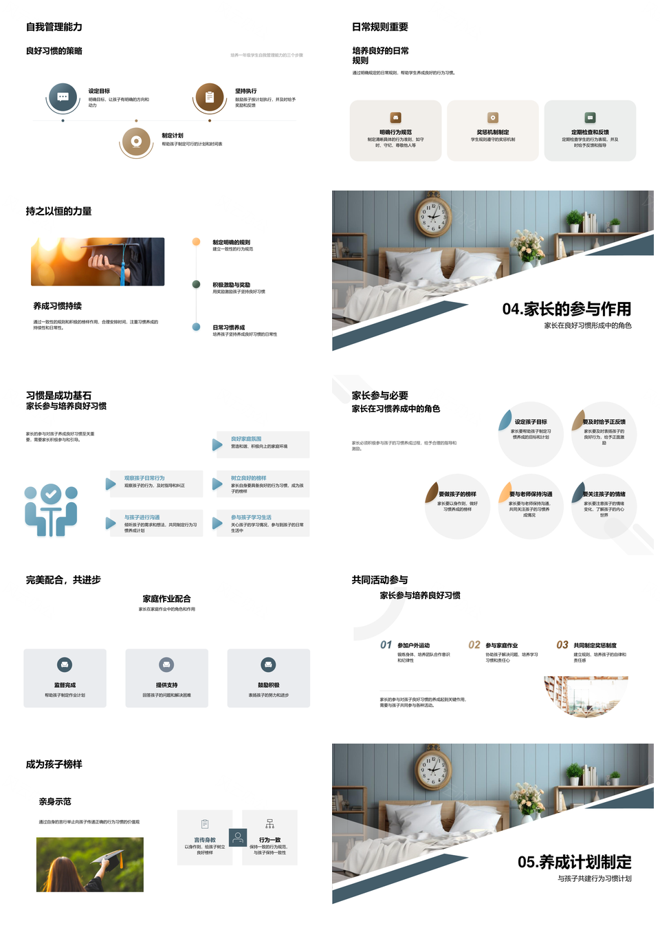 这是一张家庭引导一年级学生早睡自我管理习惯培养PPT模板,包含家庭、引导、一年级学生、早睡、自我管理、习惯培养等主题内容,也可用作家庭引导一年级学生、引导一年级学生早睡、一年级学生早睡自我管理、学生早睡自我管理习惯、早睡自我管理习惯培养、家庭引导一年级、引导一年级学生、一年级学生早睡、学生早睡自我管理、早睡自我管理习惯、自我管理习惯培养、家庭引导、引导一年级、一年级学生、学生早睡等PPT场景使用。 风云办公提供的家庭引导一年级学生早睡自我管理习惯培养PPT模板,下载格式为pptx,一共33页,作品中文字及图均可以修改和编辑,图片更改请在作品中右键图片并更换,文字修改请直接点击文字进行修改。