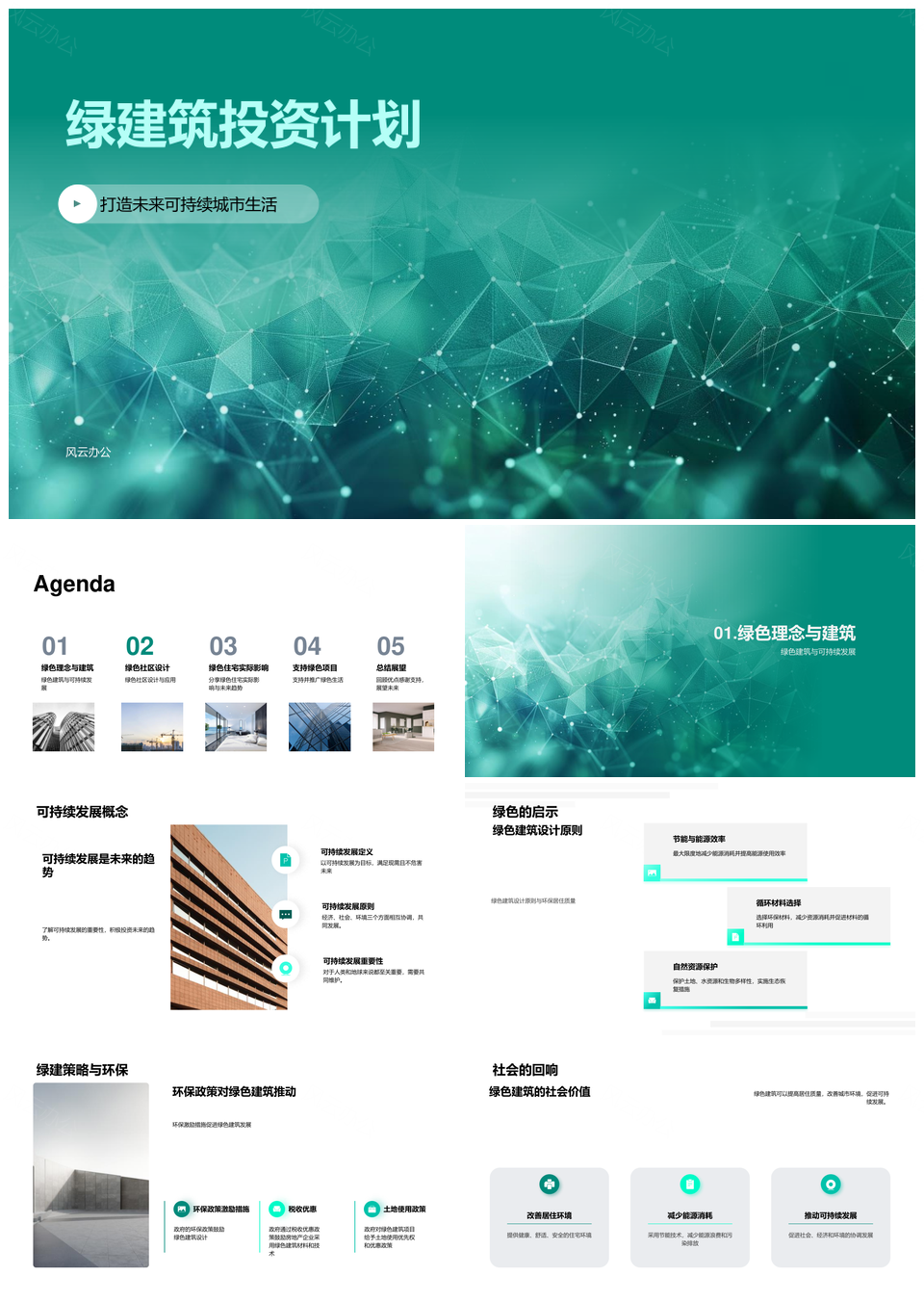 这是一张绿建筑投资计划推动可持续绿色设计节能环保社区建材PPT模板,包含绿色建筑、投资计划、推动、可持续、绿色设计、节能、环保、社区、建材等主题内容,也可用作绿建筑投资计划推动可持续绿色设计、推动可持续绿色设计节能、可持续绿色设计节能环保、绿色设计节能环保社区、设计节能环保社区建材、绿建筑投资计划推动、投资计划推动可持续、计划推动可持续绿色、推动可持续绿色设计、可持续绿色设计节能、绿色设计节能环保、设计节能环保社区、节能环保社区建材、绿建筑投资计划、投资计划推动等PPT场景使用。 风云办公提供的绿建筑投资计划推动可持续绿色设计节能环保社区建材PPT模板,下载格式为pptx,一共27页,作品中文字及图均可以修改和编辑,图片更改请在作品中右键图片并更换,文字修改请直接点击文字进行修改。