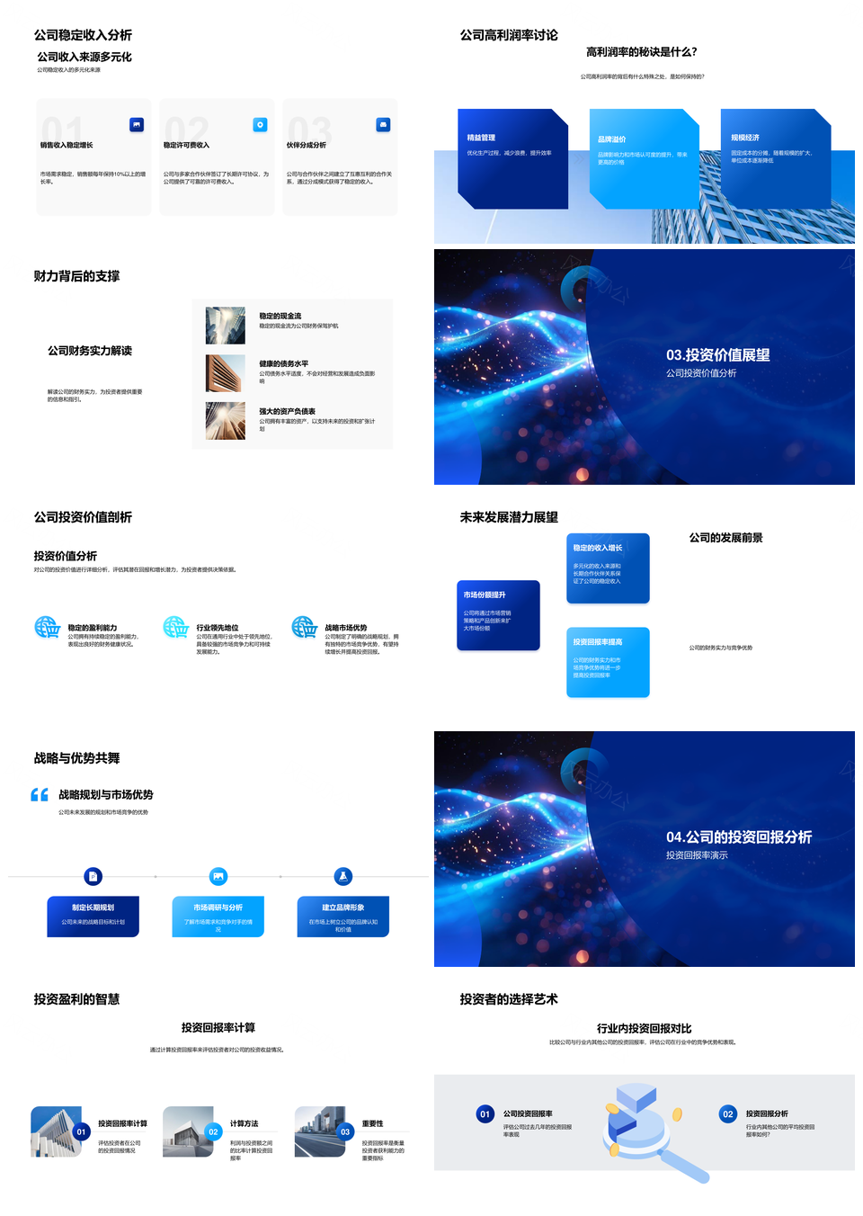 这是一张季度财务稳定收入高利润率投资价值回报率PPT模板,包含季度、财务、稳定、收入、高利润率、投资、价值、回报率等主题内容,也可用作季度财务稳定收入、财务稳定收入利润率、稳定收入利润率投资、收入利润率投资价值、利润率投资价值回报率、季度财务稳定、财务稳定收入、稳定收入利润率、收入利润率投资、利润率投资价值、投资价值回报率、季度财务、财务稳定、稳定收入、收入利润率等PPT场景使用。 风云办公提供的季度财务稳定收入高利润率投资价值回报率PPT模板,下载格式为pptx,一共23页,作品中文字及图均可以修改和编辑,图片更改请在作品中右键图片并更换,文字修改请直接点击文字进行修改。