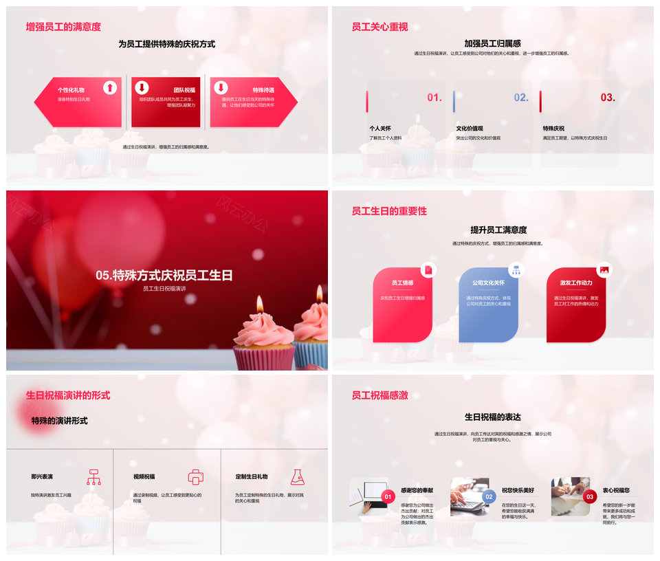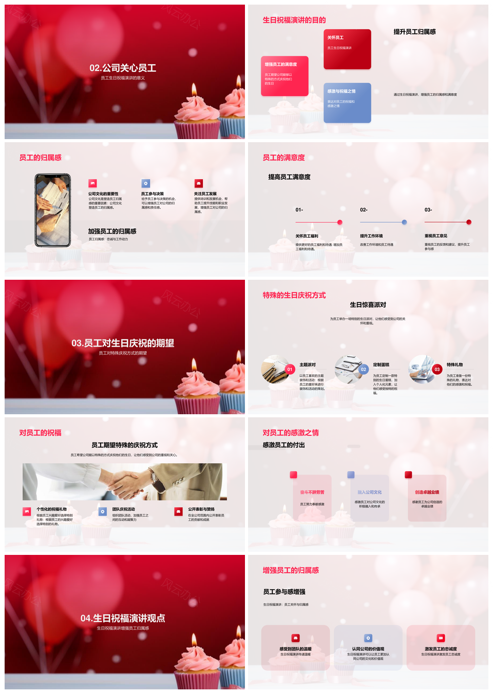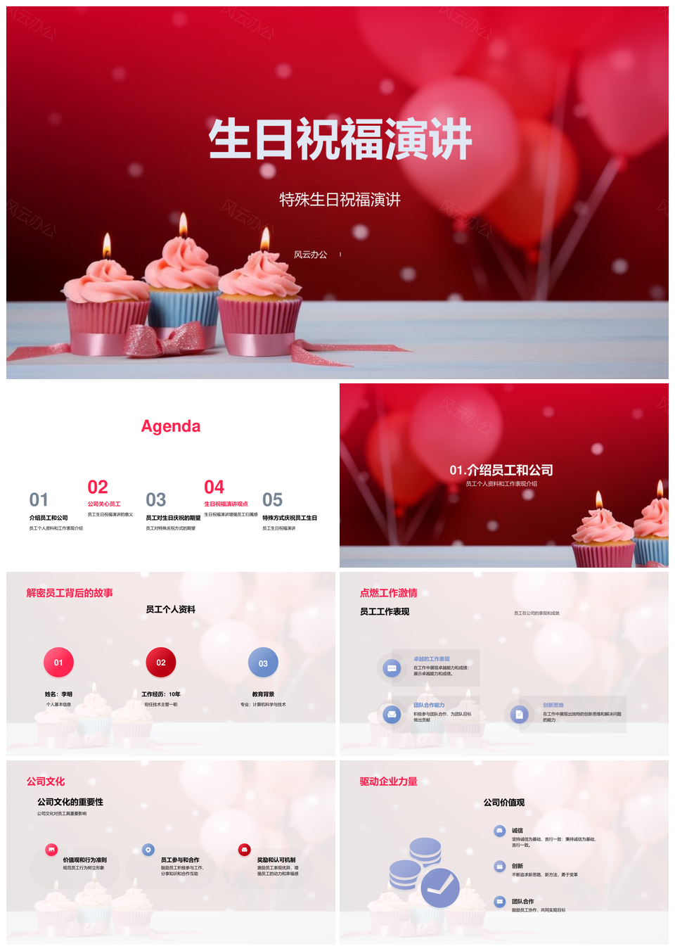 这是一张员工生日演讲工作表现公司文化归属感祝福PPT模板,包含员工、生日、演讲、工作、表现、公司、文化、归属感、祝福等主题内容,也可用作员工生日公司祝福、公司文化归属感祝福、生日演讲工作表现、工作表现公司文化、公司文化归属感、员工生日祝福、工作表现公司、表现公司文化、文化归属感祝福、生日演讲祝福、公司文化、文化归属感、归属感祝福、员工生日、工作表现等PPT场景使用。 风云办公提供的员工生日演讲工作表现公司文化归属感祝福PPT模板,下载格式为pptx,一共24页,作品中文字及图均可以修改和编辑,图片更改请在作品中右键图片并更换,文字修改请直接点击文字进行修改。