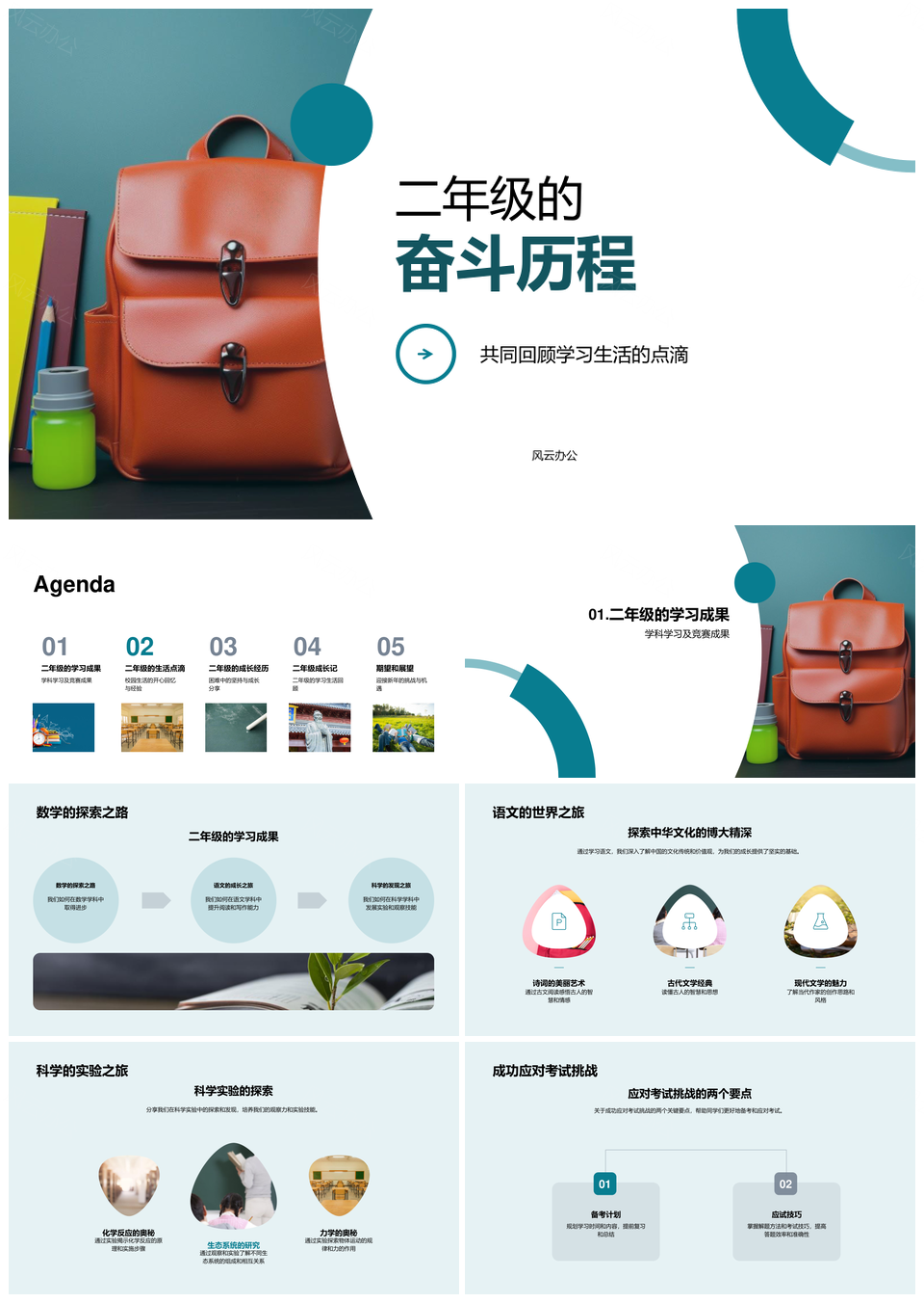 风云办公提供的二年级数语科竞赛考试校园奋斗成果PPT模板,下载格式为pptx,一共33页,作品中文字及图均可以修改和编辑,图片更改请在作品中右键图片并更换,文字修改请直接点击文字进行修改。