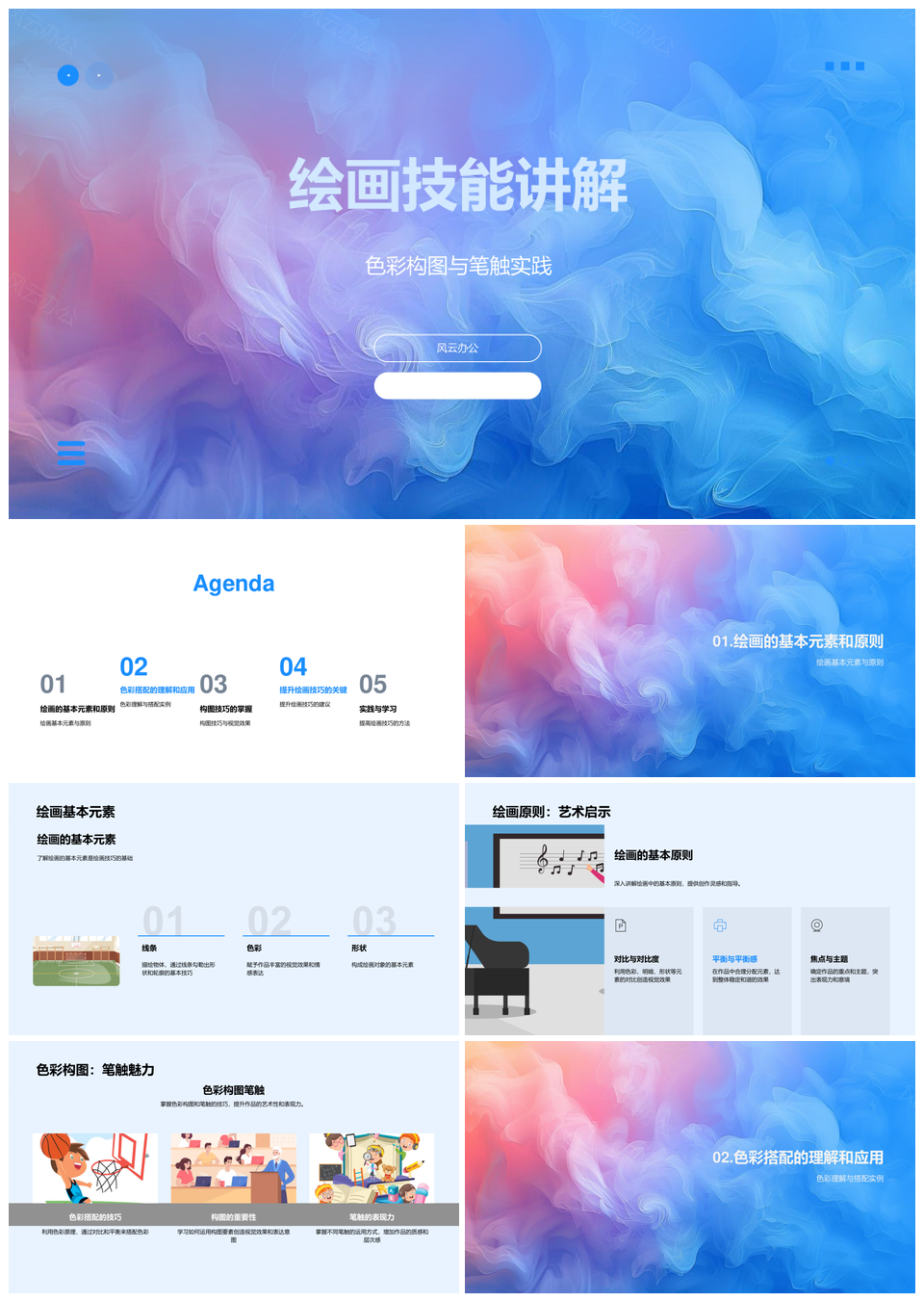 风云办公提供的绘画基础色彩构图笔触技法解析PPT模板,下载格式为pptx,一共23页,作品中文字及图均可以修改和编辑,图片更改请在作品中右键图片并更换,文字修改请直接点击文字进行修改。