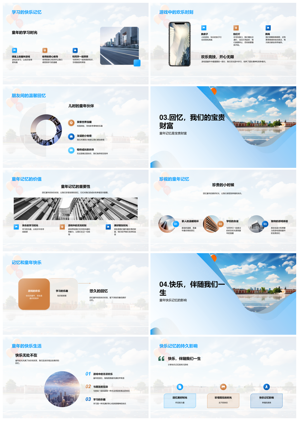 风云办公提供的童年乐学游戏欢庆六一珍爱五彩记忆PPT模板,下载格式为pptx,一共23页,作品中文字及图均可以修改和编辑,图片更改请在作品中右键图片并更换,文字修改请直接点击文字进行修改。