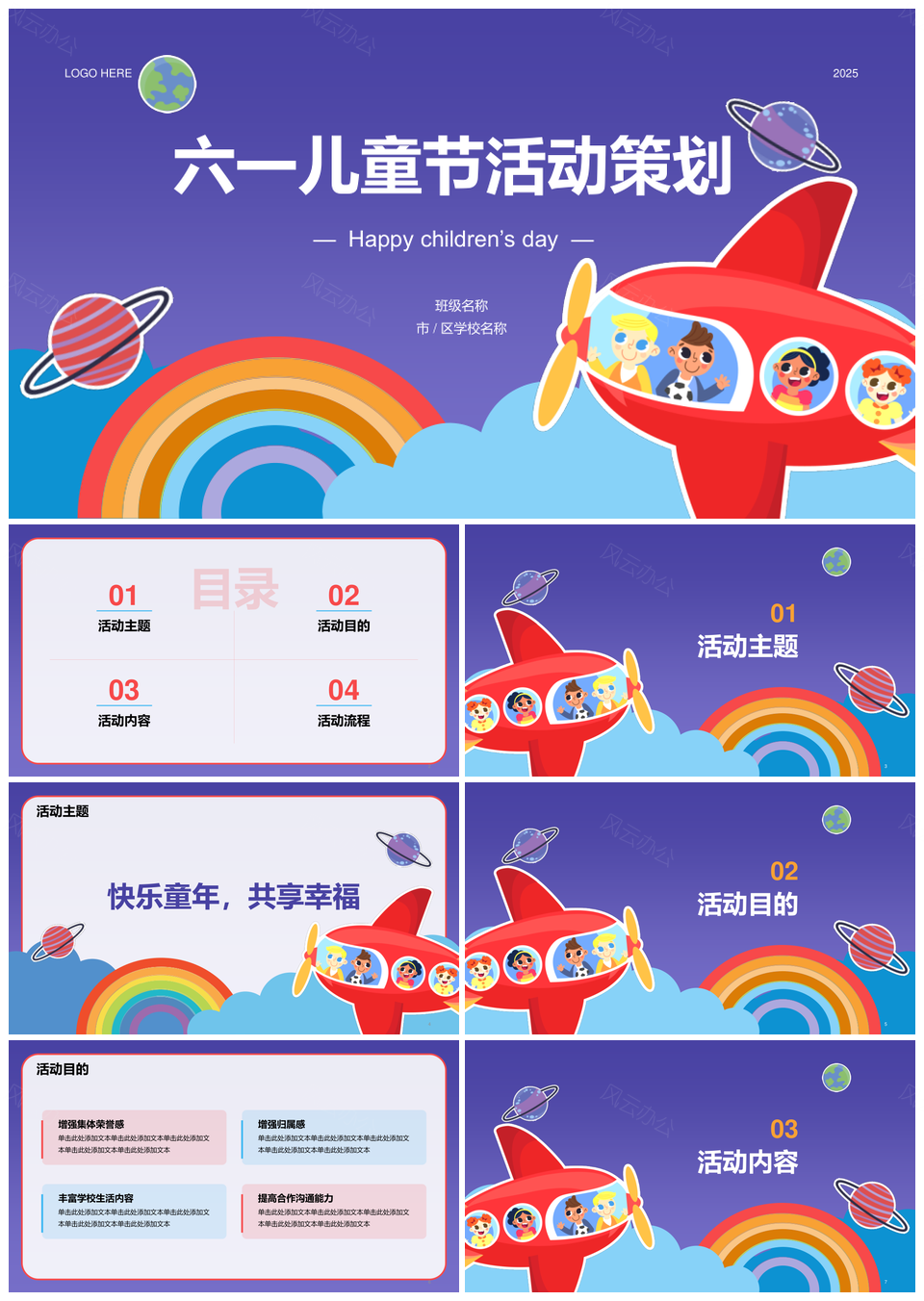 2025紫红蓝插画六一儿童节活动策划PPT模板