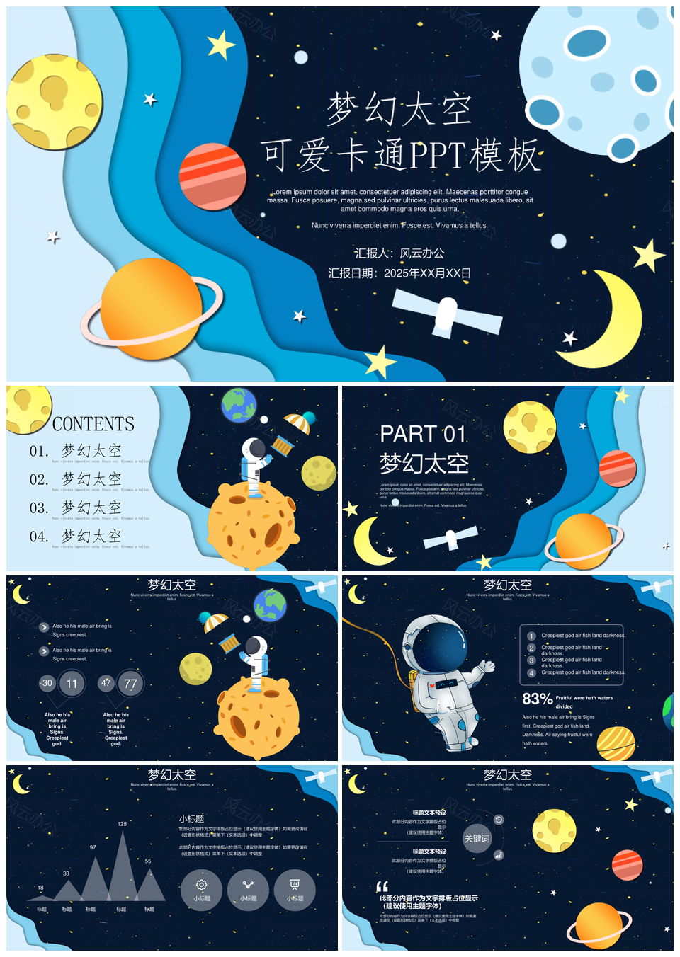 风云办公提供的2025可爱卡通太空教育教学通用PPT模板,下载格式为pptx,一共24页,作品中文字及图均可以修改和编辑,图片更改请在作品中右键图片并更换,文字修改请直接点击文字进行修改。