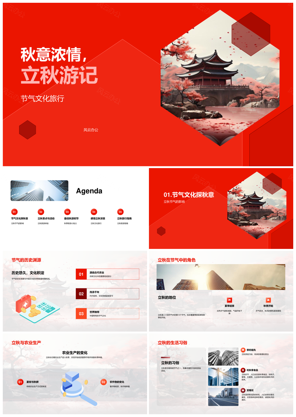 风云办公提供的立秋节气文化游赏枫叶自然风光PPT模板,下载格式为pptx,一共33页,作品中文字及图均可以修改和编辑,图片更改请在作品中右键图片并更换,文字修改请直接点击文字进行修改。