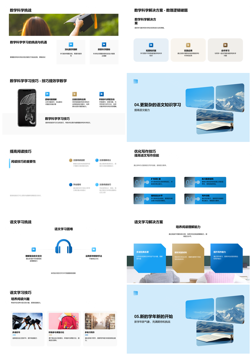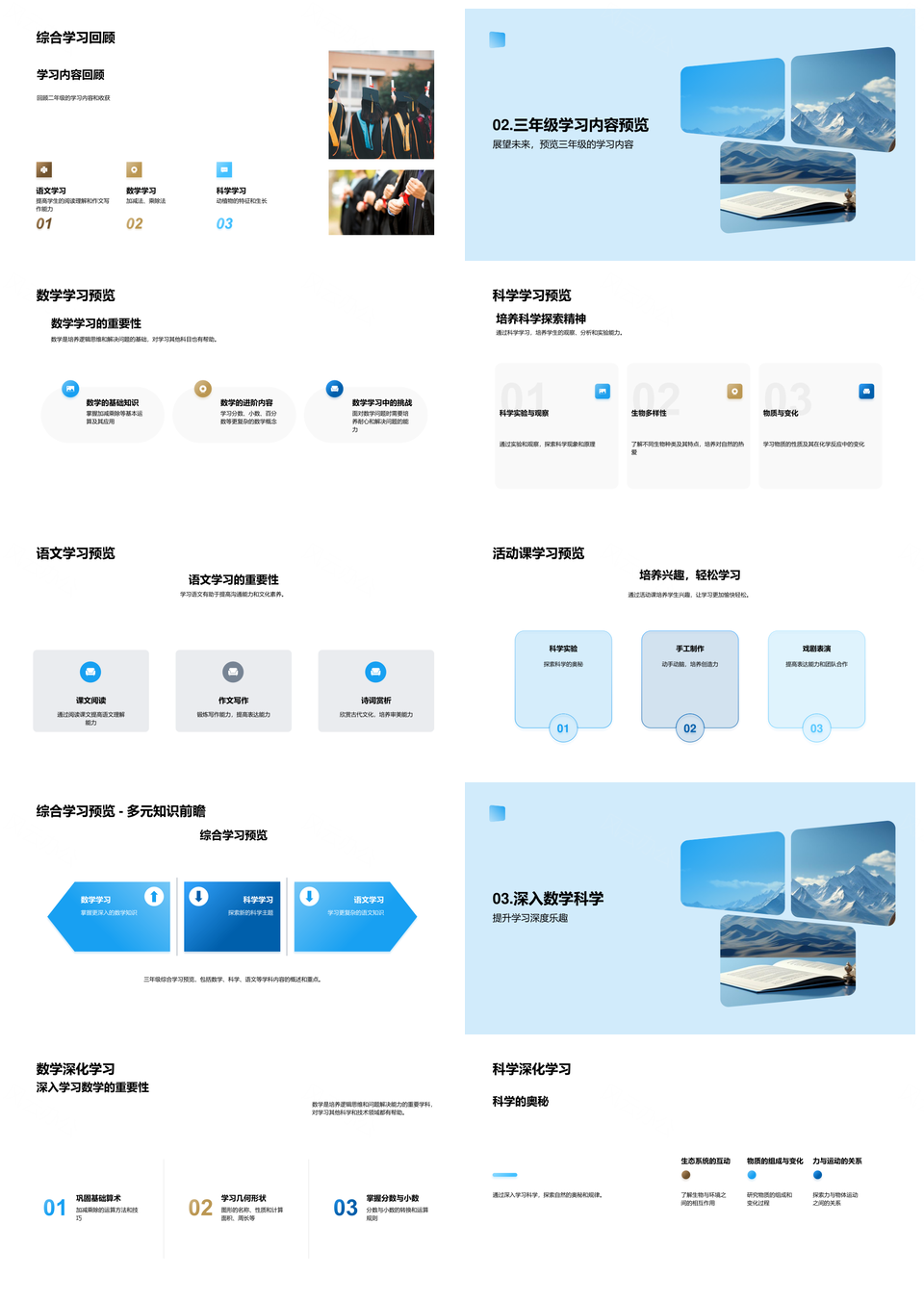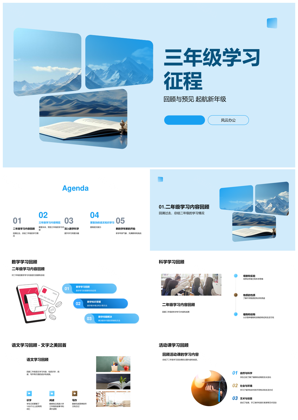 这是一张三年级新学年数理科学语文综合学习征程PPT模板,包含三年级、新学年、数理、科学、语文、综合学习、征程等主题内容,也可用作三年级新学年数理科学语文、三年级新学年数理科学综合学习、三年级新学年语文综合学习、新学年数理科学语文综合学习、三年级新学年数理科学、新学年数理科学语文、三年级数理科学语文综合学习、三年级语文综合学习、数理科学语文综合学习、新学年语文综合学习、语文综合学习征程、三年级新学年、新学年数理科学、数理科学语文、语文综合学习等PPT场景使用。 风云办公提供的三年级新学年数理科学语文综合学习征程PPT模板,下载格式为pptx,一共33页,作品中文字及图均可以修改和编辑,图片更改请在作品中右键图片并更换,文字修改请直接点击文字进行修改。