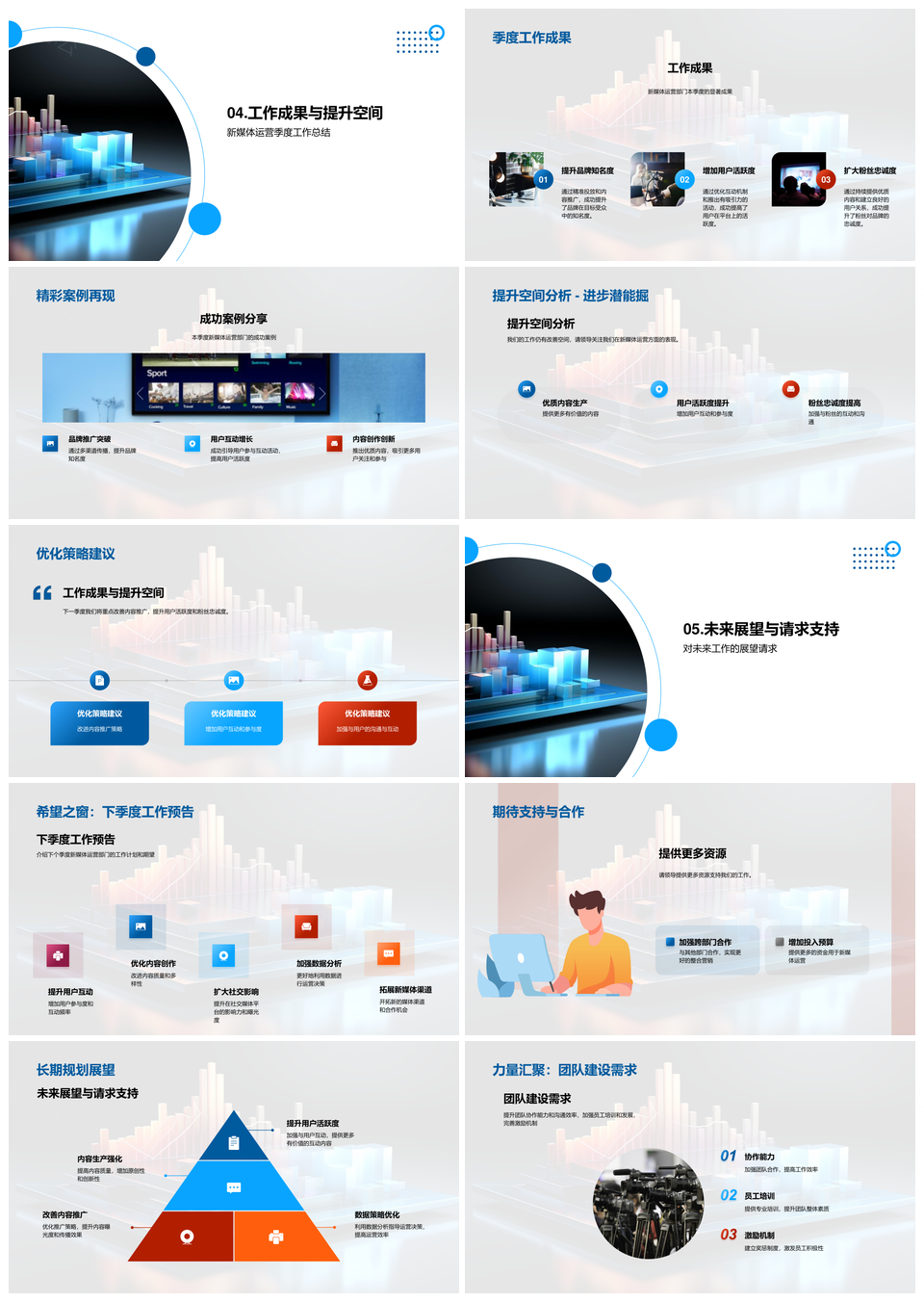 这是一张新媒体运营季度总结任务挑战数据品牌展望PPT模板,包含新媒体运营、季度总结、任务、挑战、数据、品牌、展望等主题内容,也可用作新媒体运营季度总结、季度总结任务挑战、任务挑战数据品牌、数据品牌展望、新媒体运营任务挑战、季度总结数据品牌、任务挑战品牌展望、运营季度总结任务、总结任务挑战数据、挑战数据品牌展望、新媒体运营、季度总结、任务挑战、数据品牌、品牌展望等PPT场景使用。 风云办公提供的新媒体运营季度总结任务挑战数据品牌展望PPT模板,下载格式为pptx,一共28页,作品中文字及图均可以修改和编辑,图片更改请在作品中右键图片并更换,文字修改请直接点击文字进行修改。