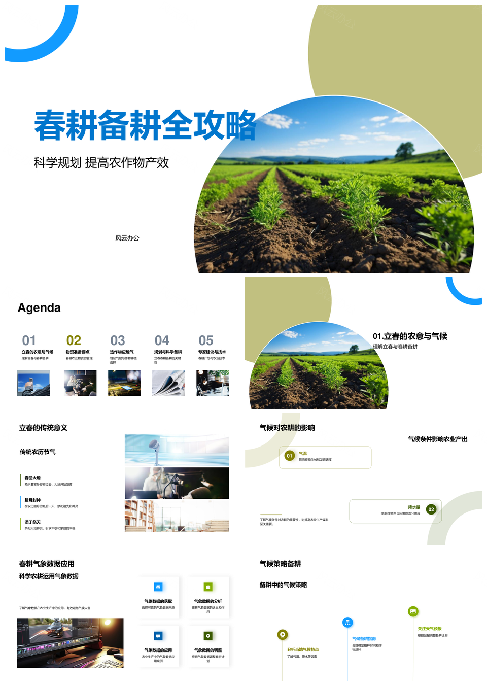 风云办公提供的春耕备耕立春气象选种施肥增产攻略PPT模板,下载格式为pptx,一共33页,作品中文字及图均可以修改和编辑,图片更改请在作品中右键图片并更换,文字修改请直接点击文字进行修改。