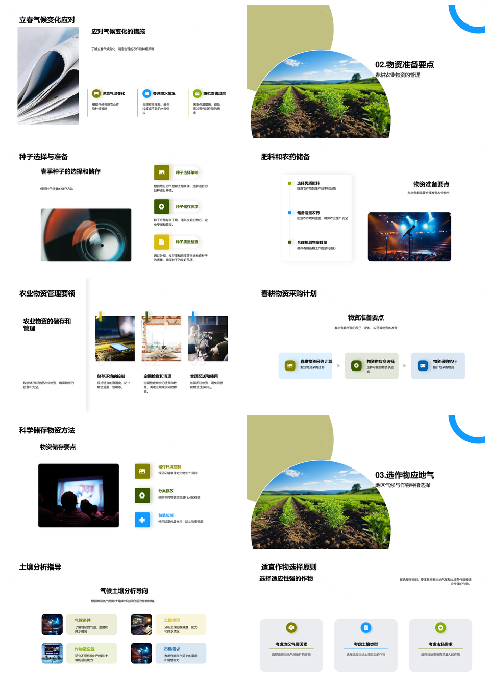 这是一张春耕备耕立春气象选种施肥增产攻略PPT模板,包含春耕、备耕、立春、气象、选种、施肥、增产、攻略等主题内容,也可用作春耕备耕选种施肥、立春气象选种施肥、选种施肥增产攻略、春耕备耕增产攻略、备耕选种施肥增产、立春选种施肥增产、春耕备耕立春气象、气象选种施肥增产、立春气象增产攻略、春耕备耕选种增产、选种施肥增产、春耕备耕选种、增产攻略、立春气象、春耕备耕等PPT场景使用。