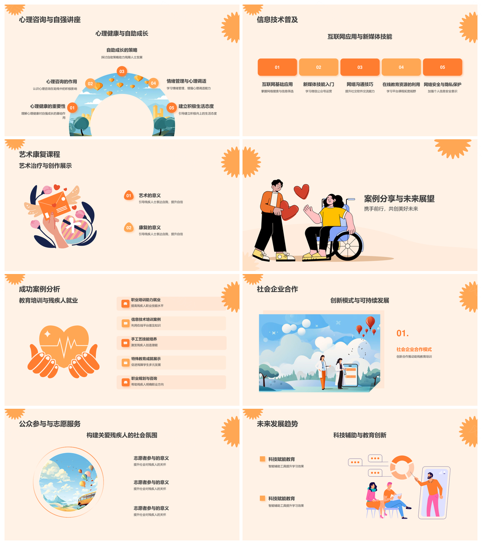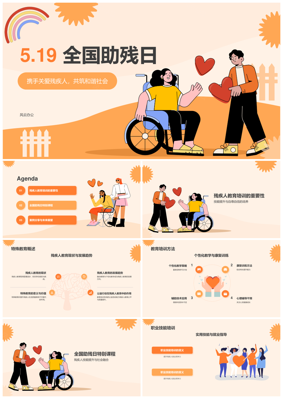 这是一张2025全国助残日技能培训助力残障自信融合教育PPT模板,包含2025、全国助残日、技能培训、助力、残障、自信、融合教育等主题内容,也可用作2025全国助残日技能培训助力、全国助残日技能培训助力残障、技能培训助力残障自信、助残日技能培训助力残障、助力残障自信融合教育、全国助残日技能培训、技能培训助力残障、助残日技能培训、助力残障自信、残障自信融合教育、全国助残日、技能培训助力、助残日助力、助力融合教育、自信融合教育等PPT场景使用。 风云办公提供的2025全国助残日技能培训助力残障自信融合教育PPT模板,下载格式为pptx,一共16页,作品中文字及图均可以修改和编辑,图片更改请在作品中右键图片并更换,文字修改请直接点击文字进行修改。