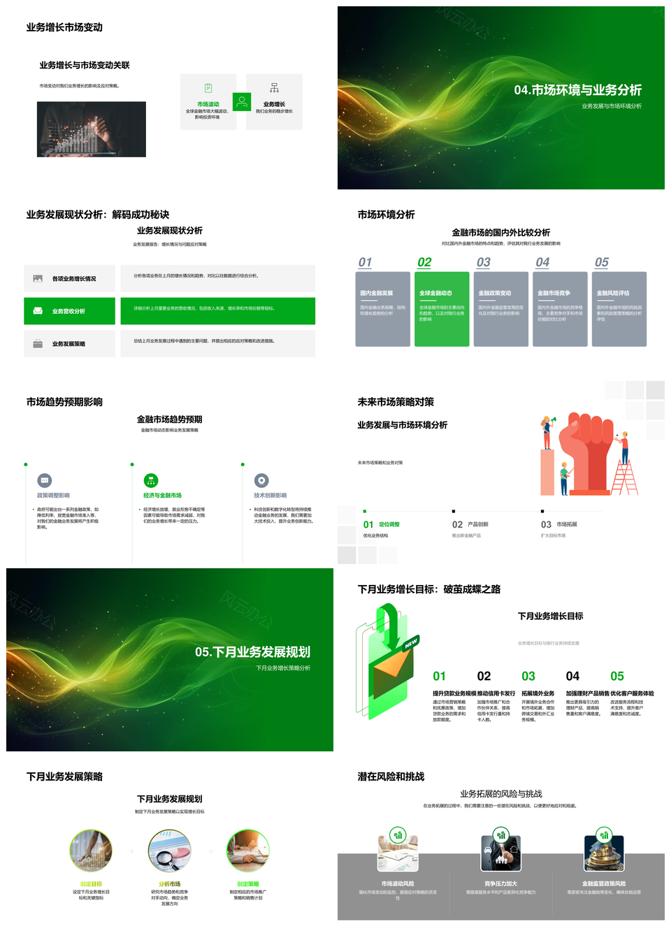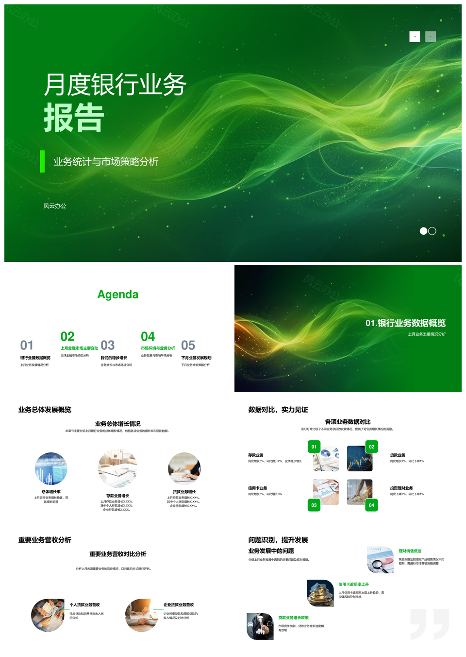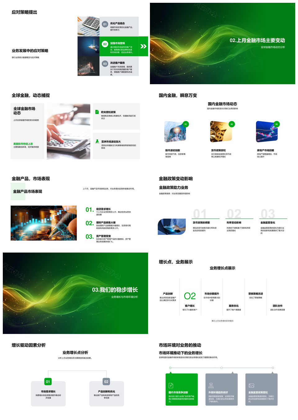 这是一张月度银行业务发展金融市场动态与政策产品表现报告PPT模板,包含月度、银行、业务、发展、金融市场、政策、产品、表现、报告等主题内容,也可用作月度银行业务发展金融市场动态、银行业务发展金融市场动态政策、发展金融市场动态政策产品、金融市场动态政策产品表现、动态政策产品表现报告、月度银行业务发展金融、银行业务发展金融市场、发展金融市场动态、金融市场动态政策、动态政策产品表现、政策产品表现报告、月度银行业务发展、银行业务金融市场、发展金融市场、金融市场动态、动态政策产品、政策产品表现、产品表现报告等PPT场景使用。 风云办公提供的月度银行业务发展金融市场动态与政策产品表现报告PPT模板,下载格式为pptx,一共29页,作品中文字及图均可以修改和编辑,图片更改请在作品中右键图片并更换,文字修改请直接点击文字进行修改。